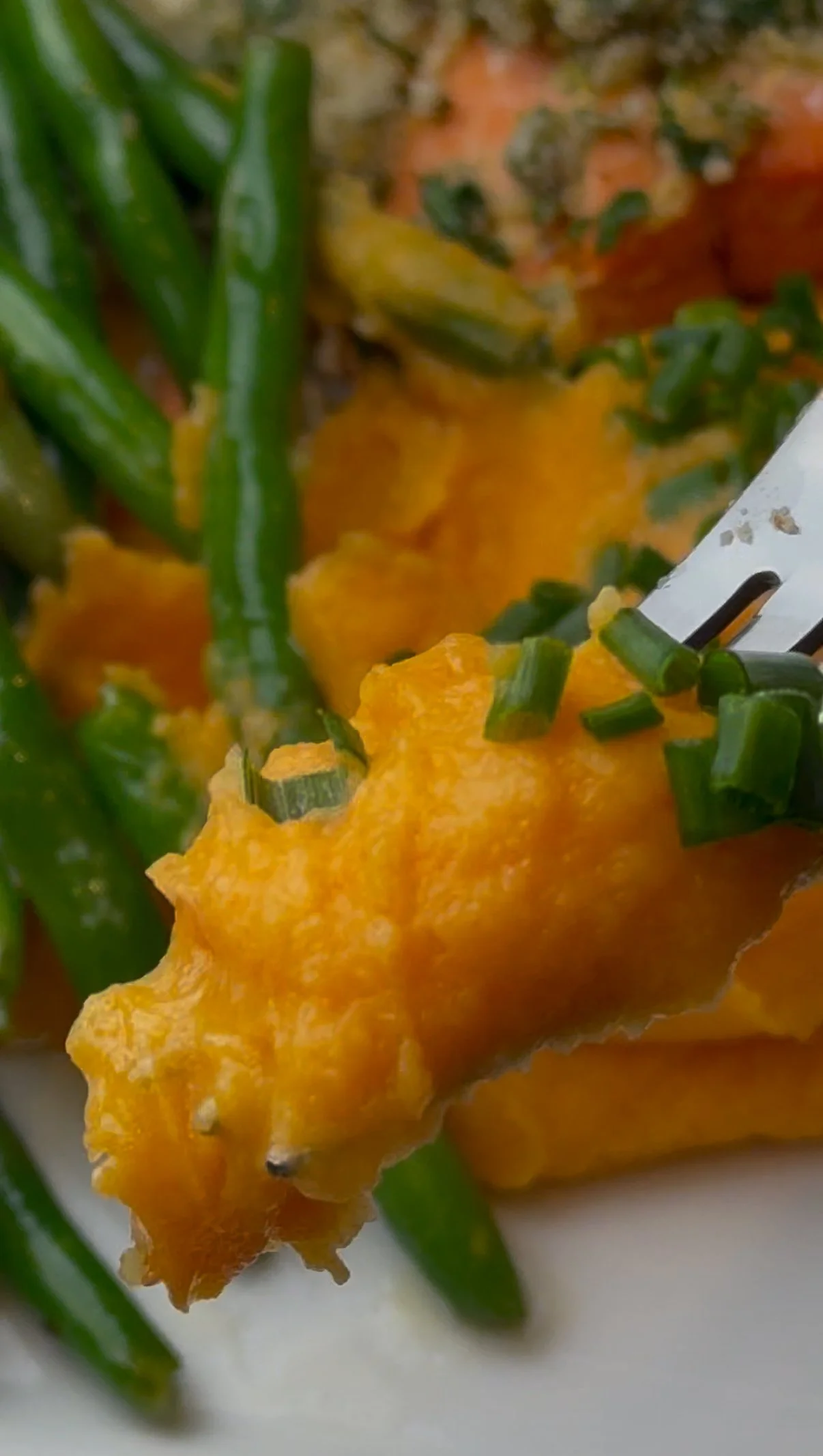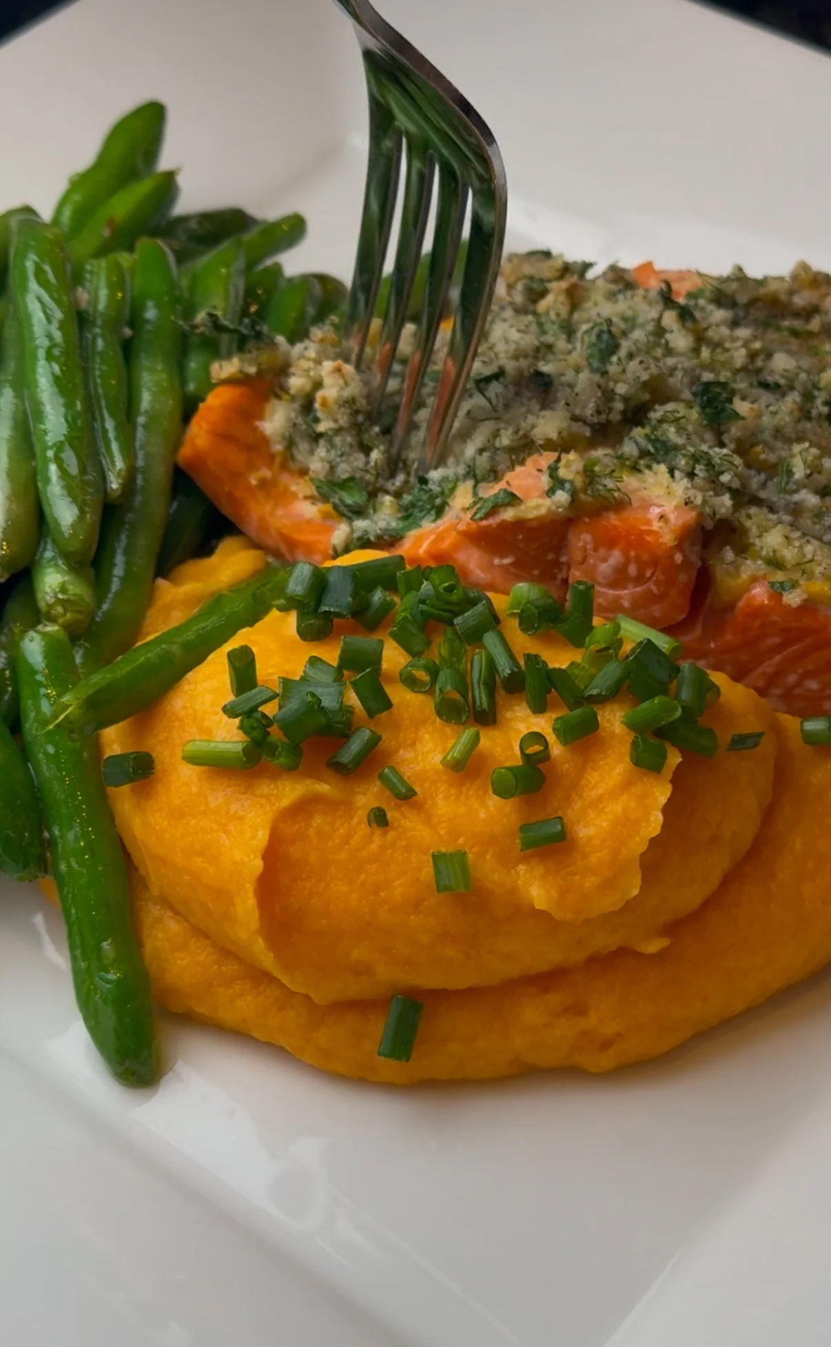 A wholesome, elegant meal featuring flakey salmon coated in fresh herbs with a velvety carrot-parsnip puree and crisp, vibrant green beans. This dish is packed with wholesome ingredients making it both satisfying and gut-healthy.