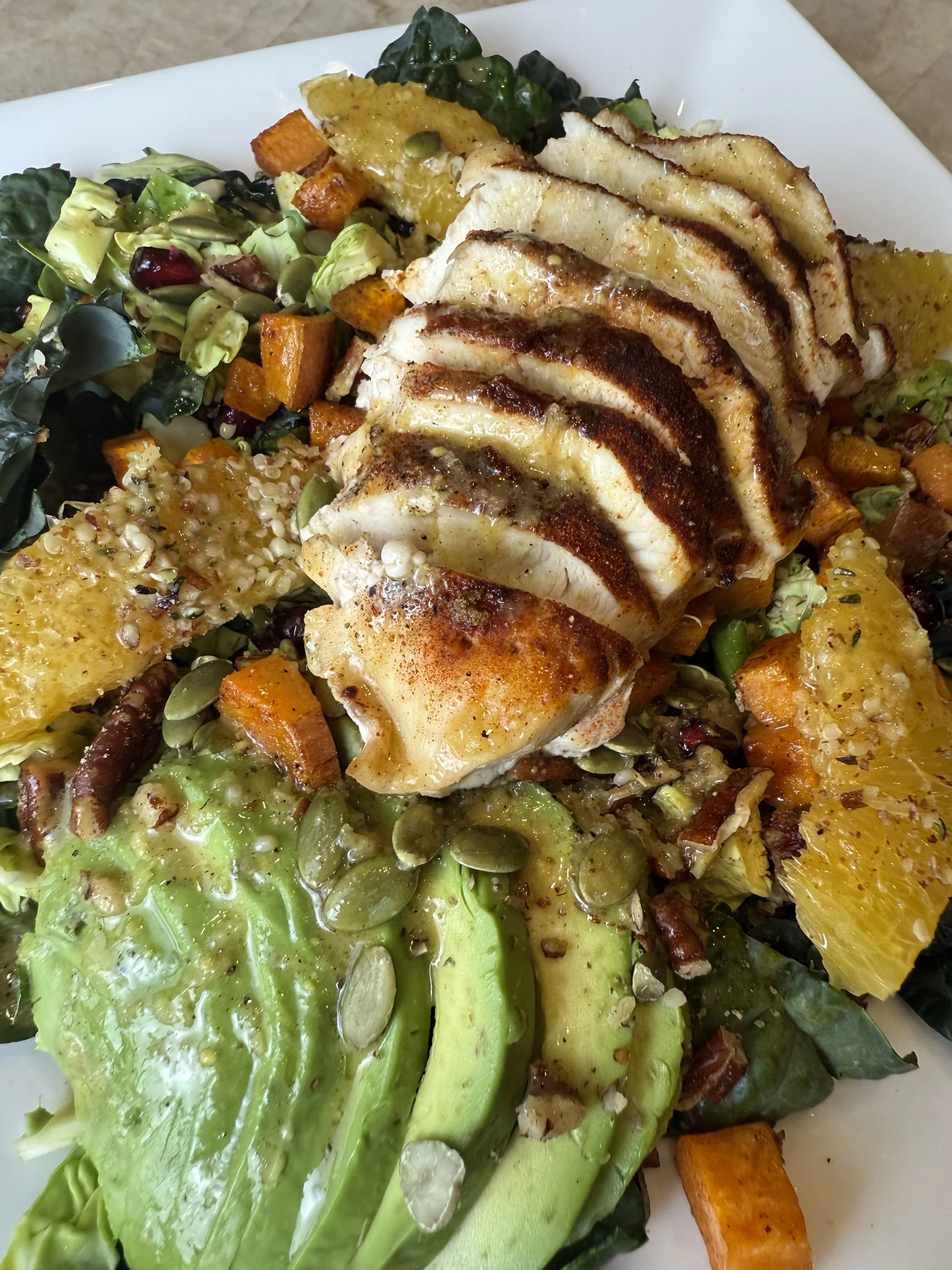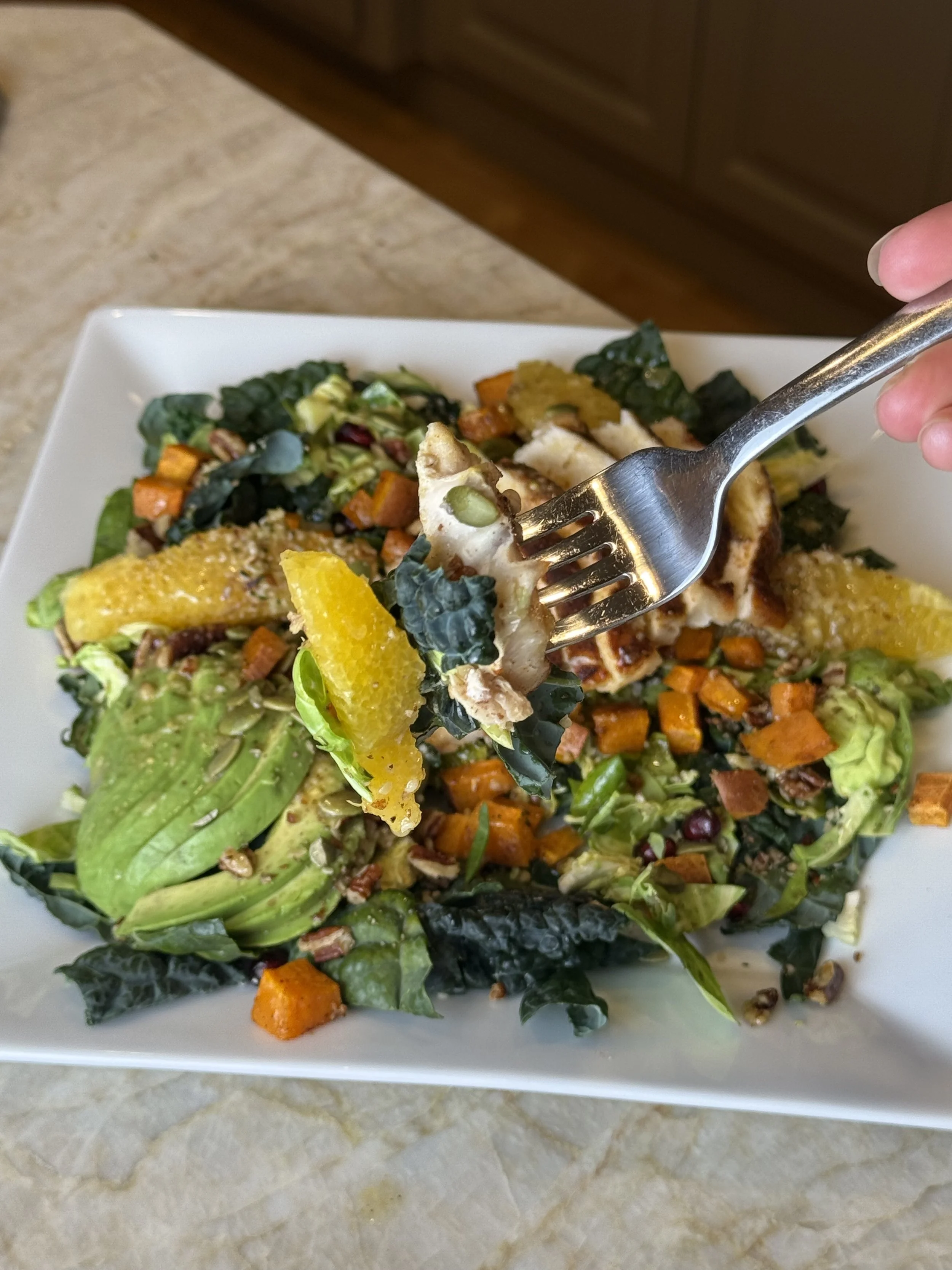 - Build the salad. Layer kale, Brussels sprouts, orange slices, pomegranate, nuts, and avocado. Top with chicken and sweet potatoes. Pour dressing over the greens and toss well.