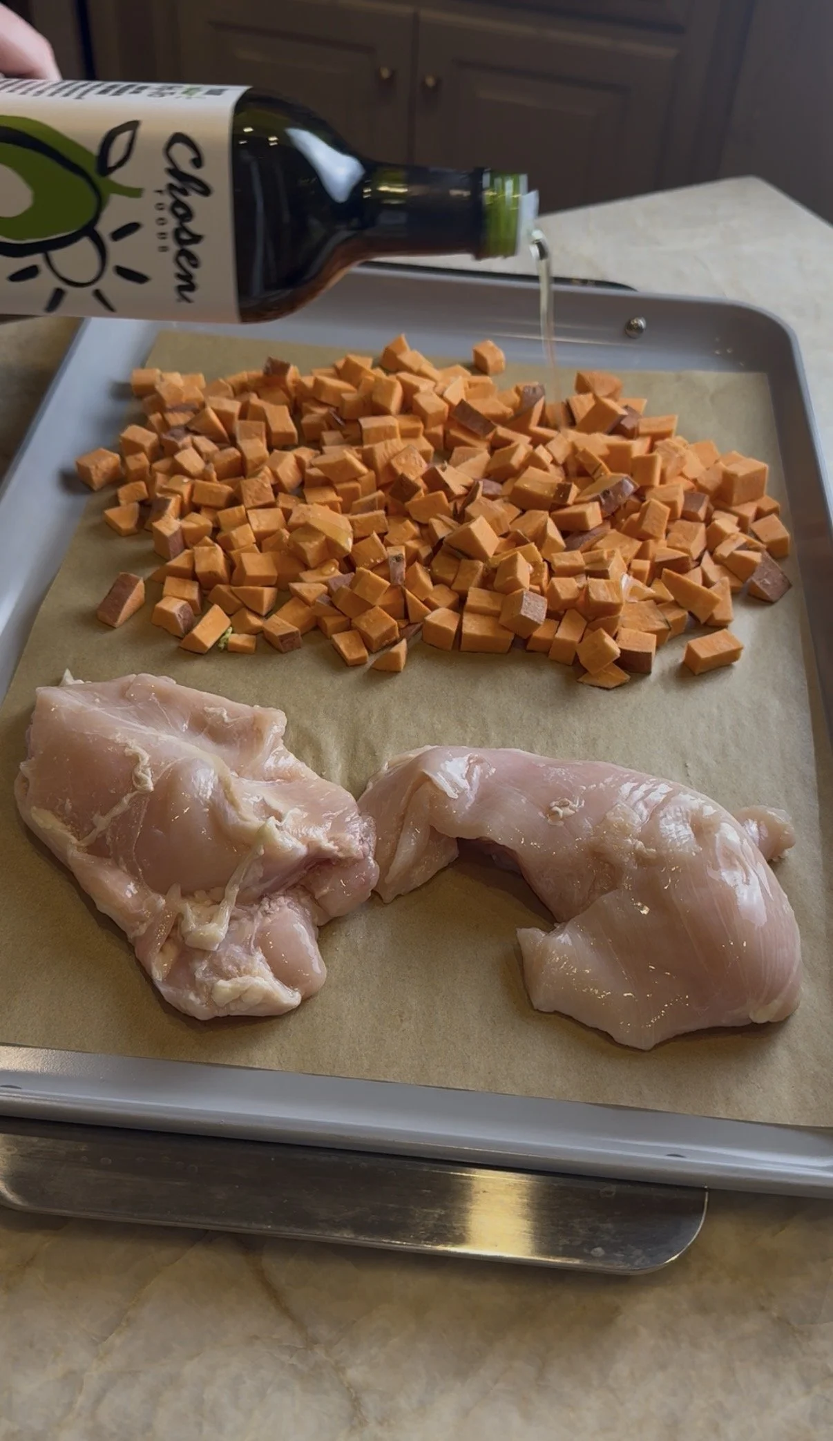 - Roast the sweet potatoes and chicken. Toss cubes with a little oil, salt, and pepper. Season chicken with salt, pepper and paprika. Roast at 425°F for 20–25 minutes.