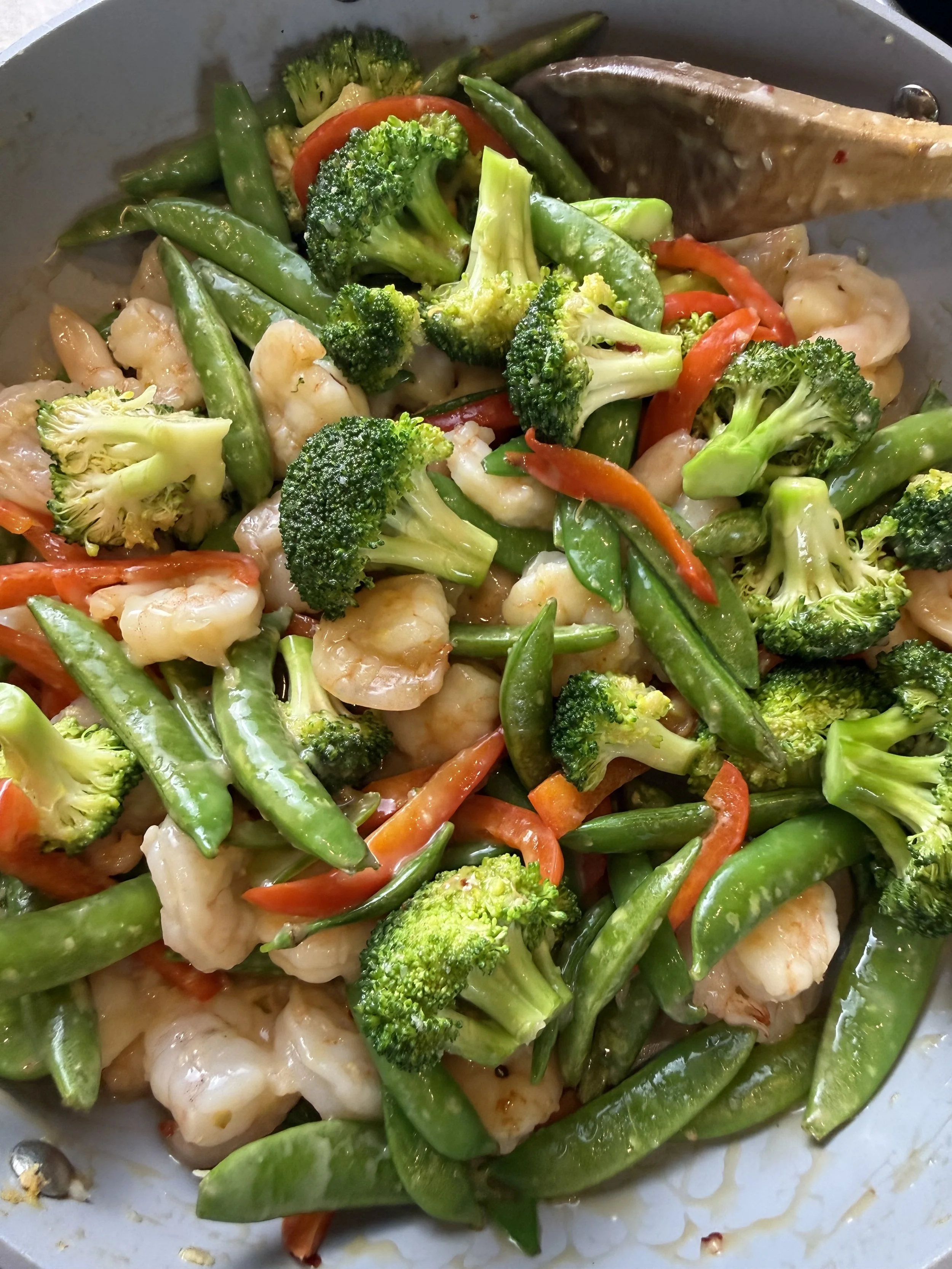 - Pour the sauce over the shrimp and vegetables. Toss to coat and cook for another 1-2 minutes to heat everything through. If the sauce is too thin, add the tbsp of arrowroot powder.