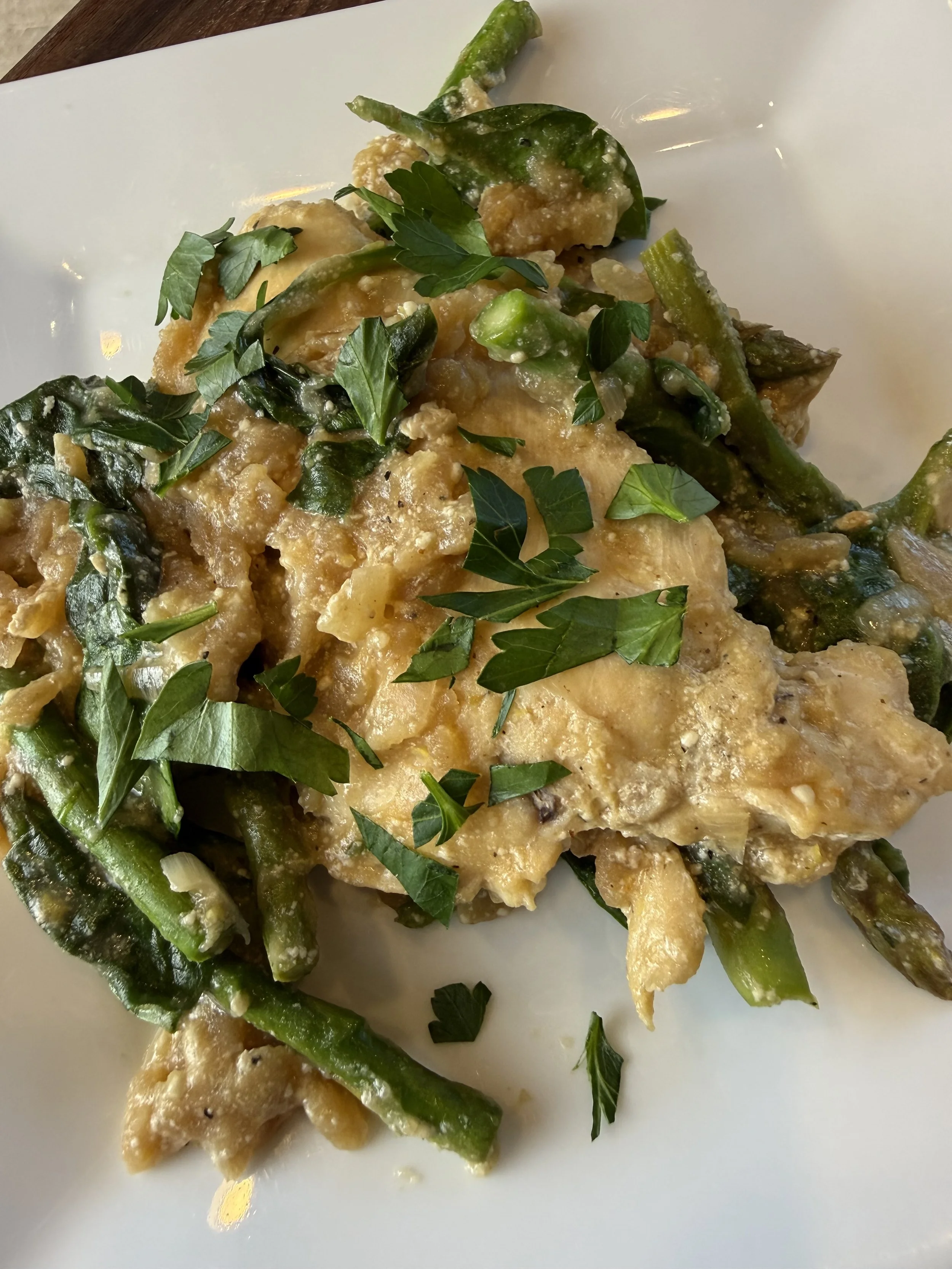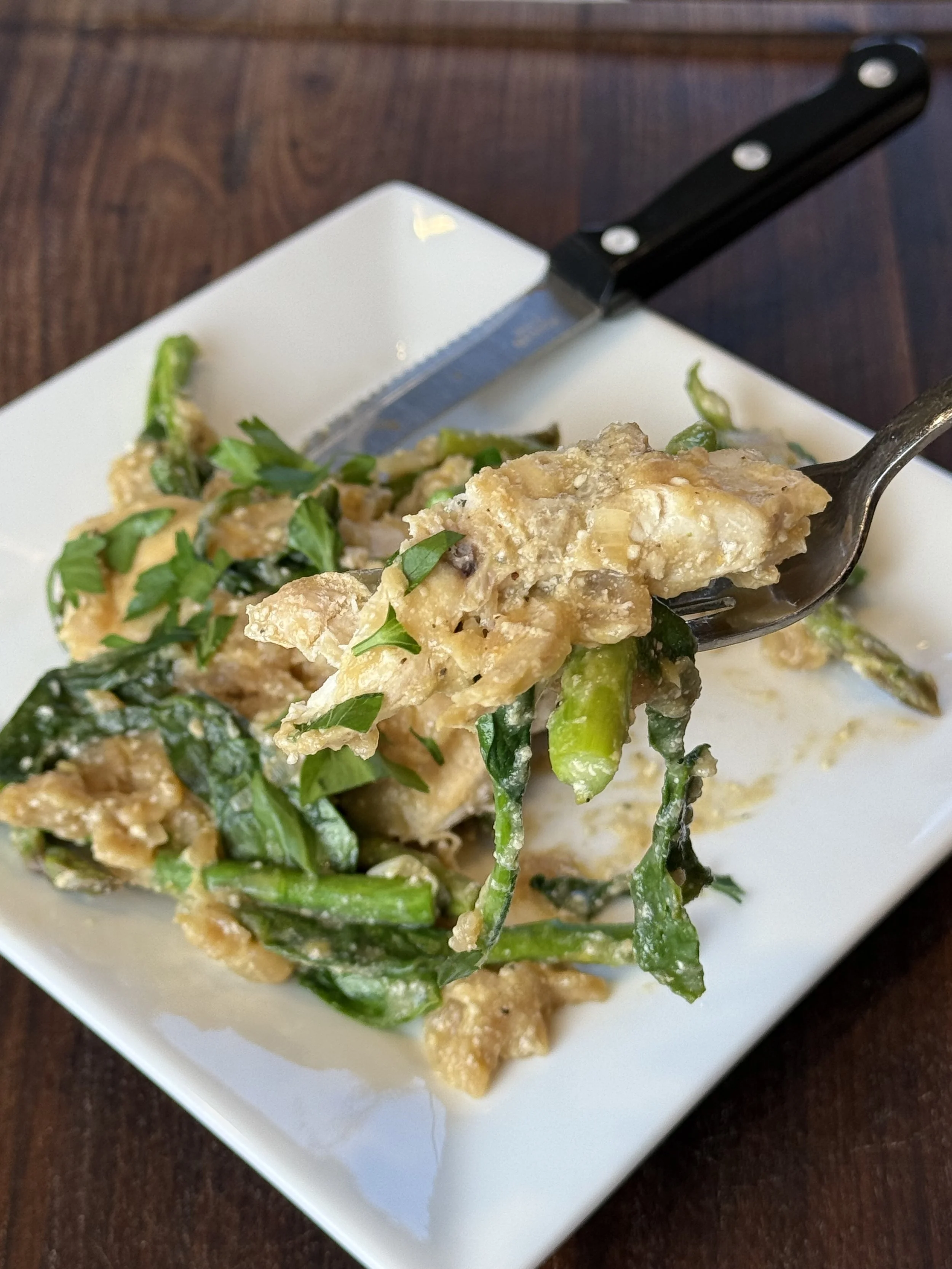 - Fold in spinach until wilted. Finish with fresh herbs + cracked pepper.