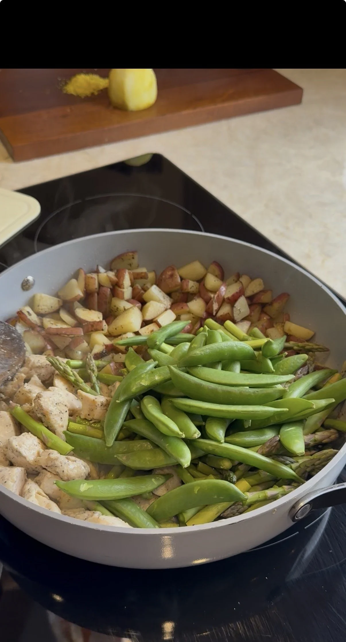 - Toss in asparagus and snap peas. Cook 3–4 minutes until bright green but still crisp.