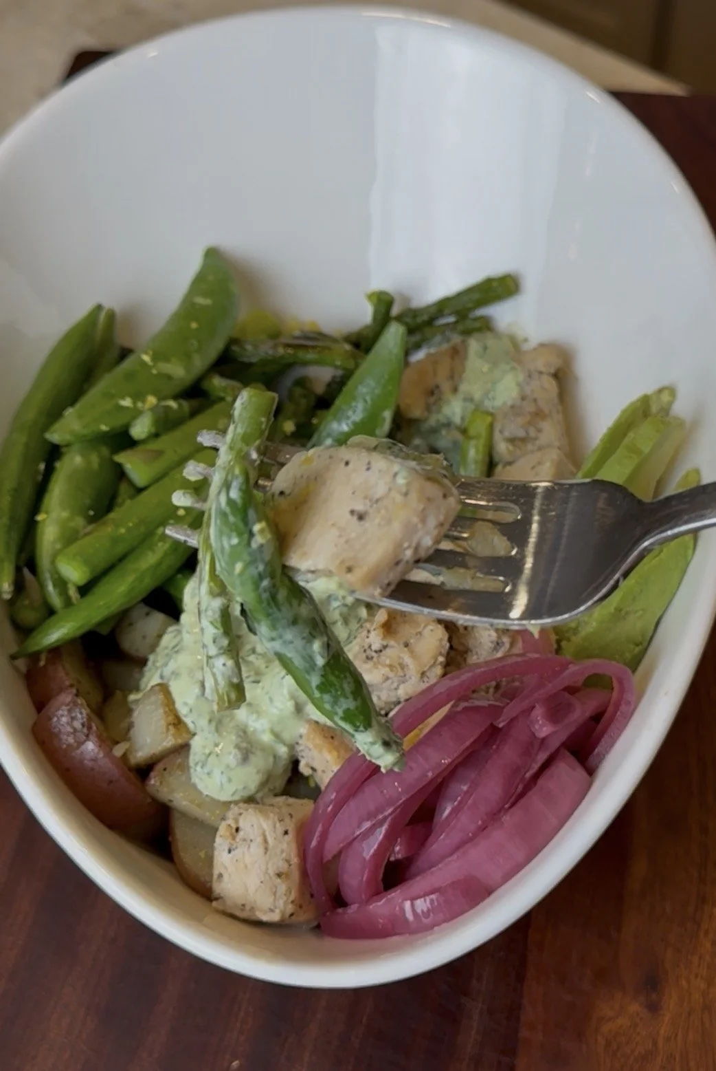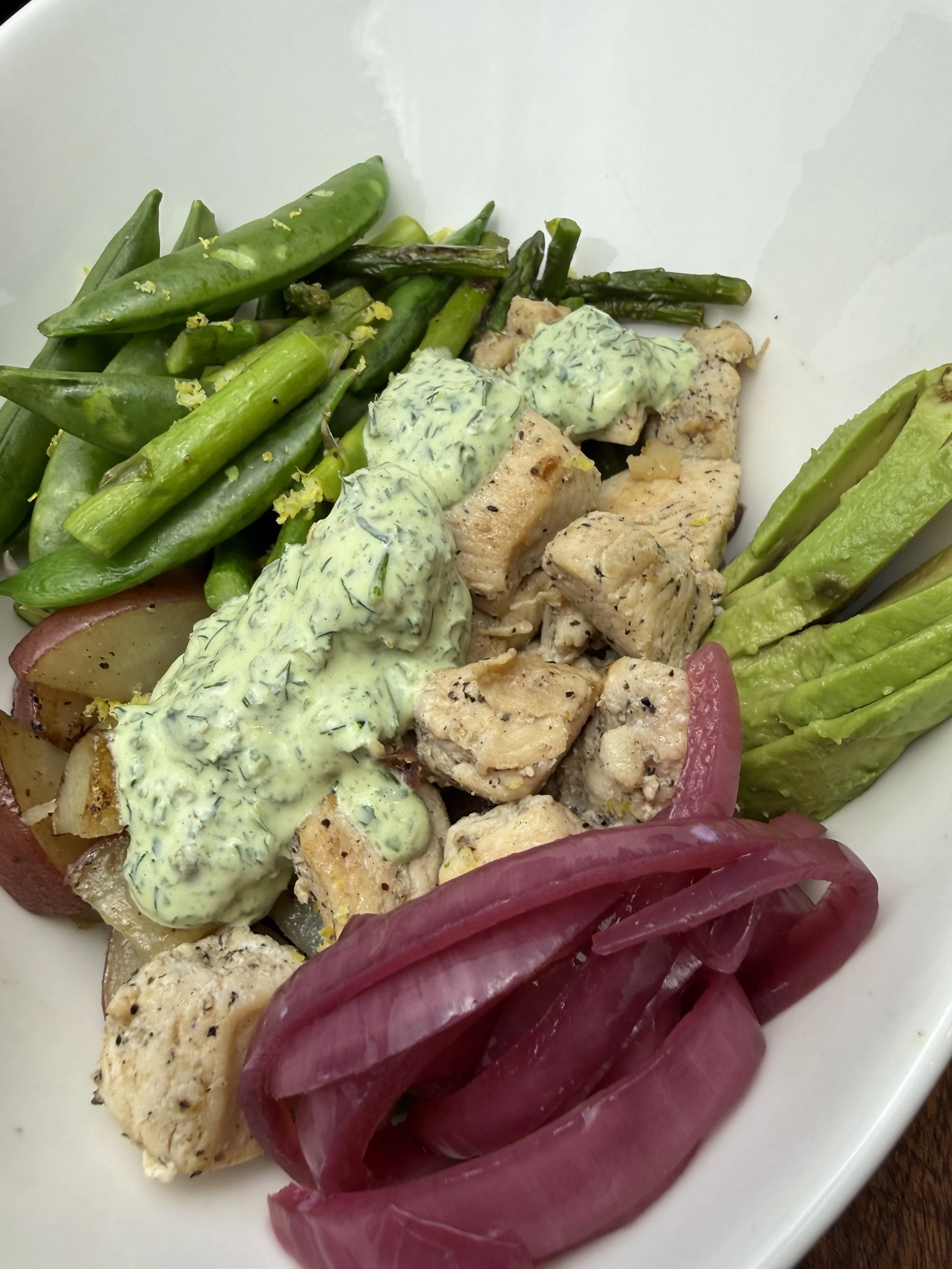 This bowl is a fresh, clean eating favorite- loaded with herby, protein-packed chicken, golden roasted potatoes, and a creamy, nutrient dense green goddess sauce. Made with whole food, gluten-free ingredients, it’s the perfect healthy dinner for anyone looking to support a balanced, gut-friendly lifestyle. Bright, satisfying, and full of flavor.