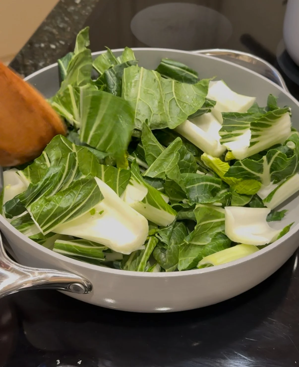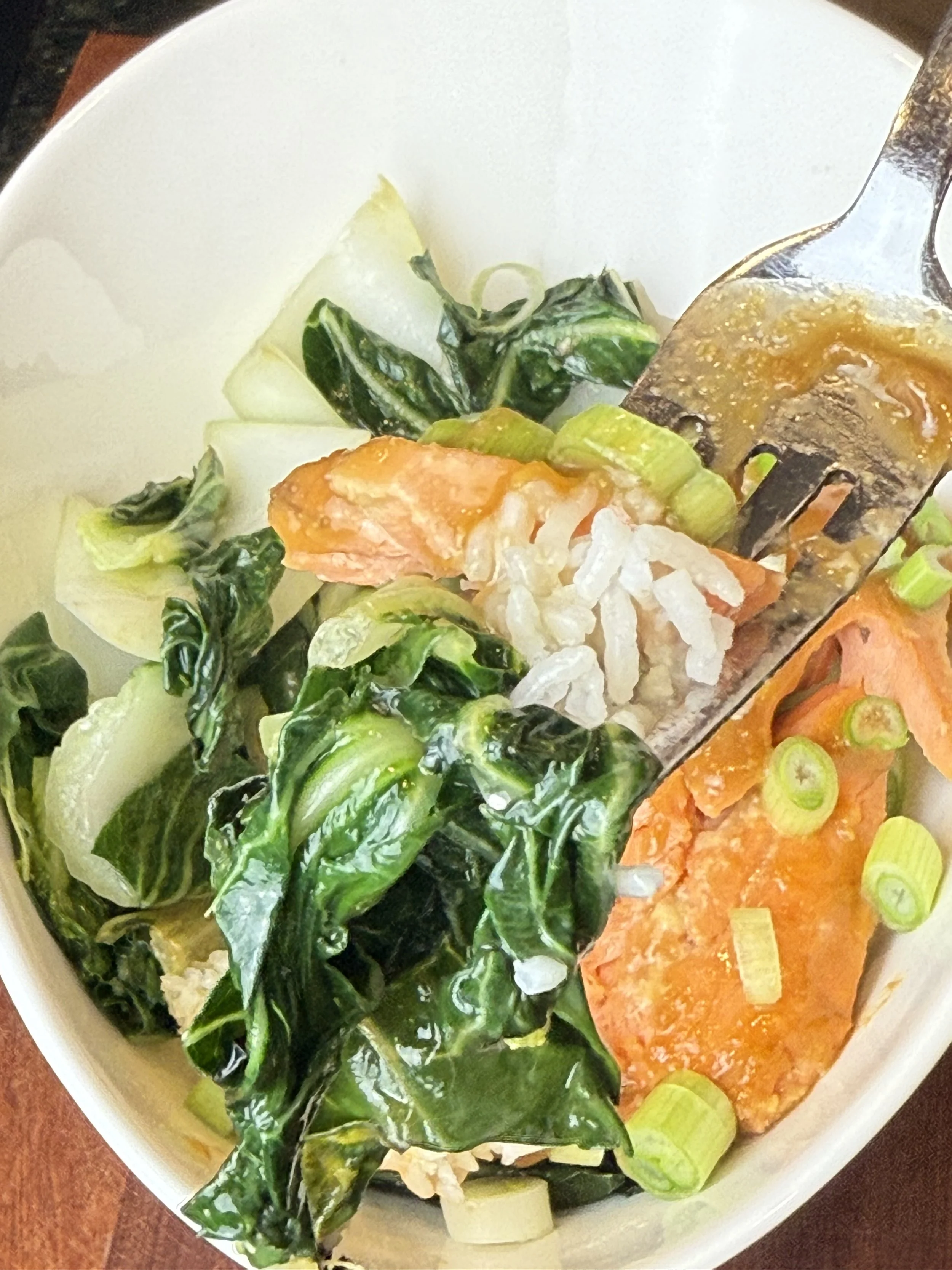 - while salmon is baking, fry chopped bok choy in a pan with avocado oil until tender.