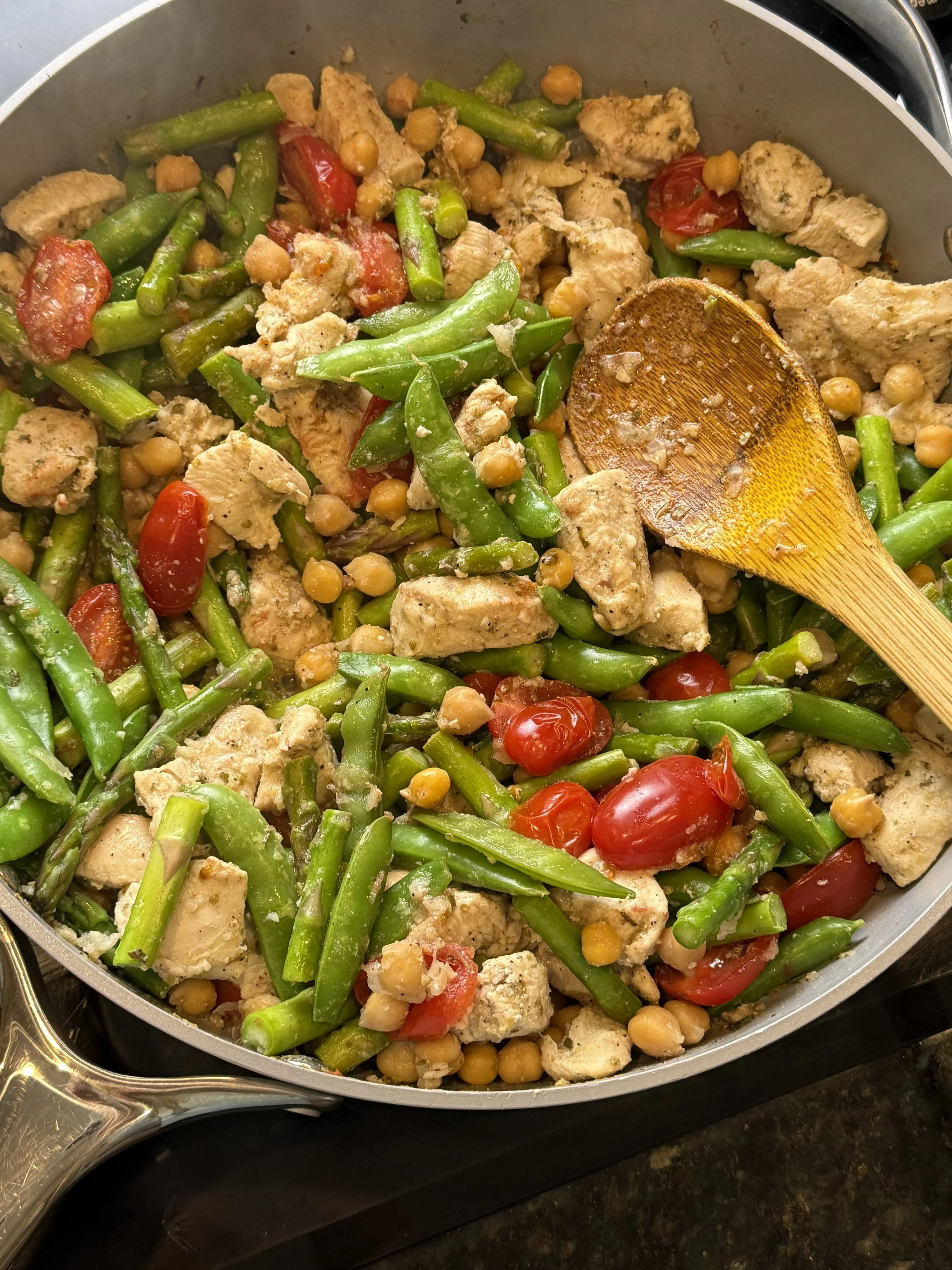 - In the same pan, add asparagus and snap peas. Sauté for 2-3 minutes until slightly tender but still crisp. Stir in cherry tomatoes and chickpeas, warming for another minute.