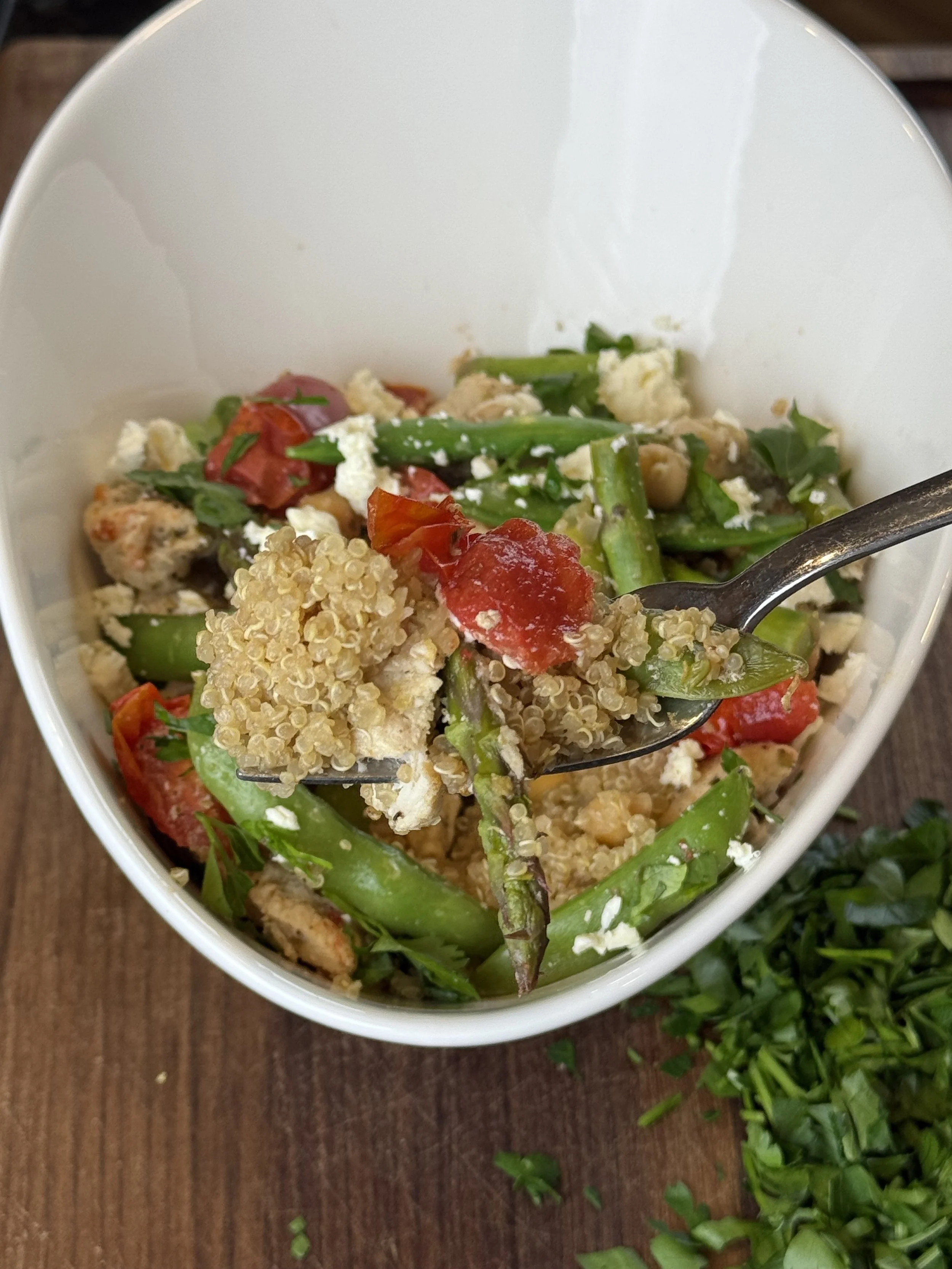 - Fluff quinoa with a fork and divide into bowls. Top with sliced chicken, sautéed veggies, and a sprinkle of fresh parsley. Add feta if using.