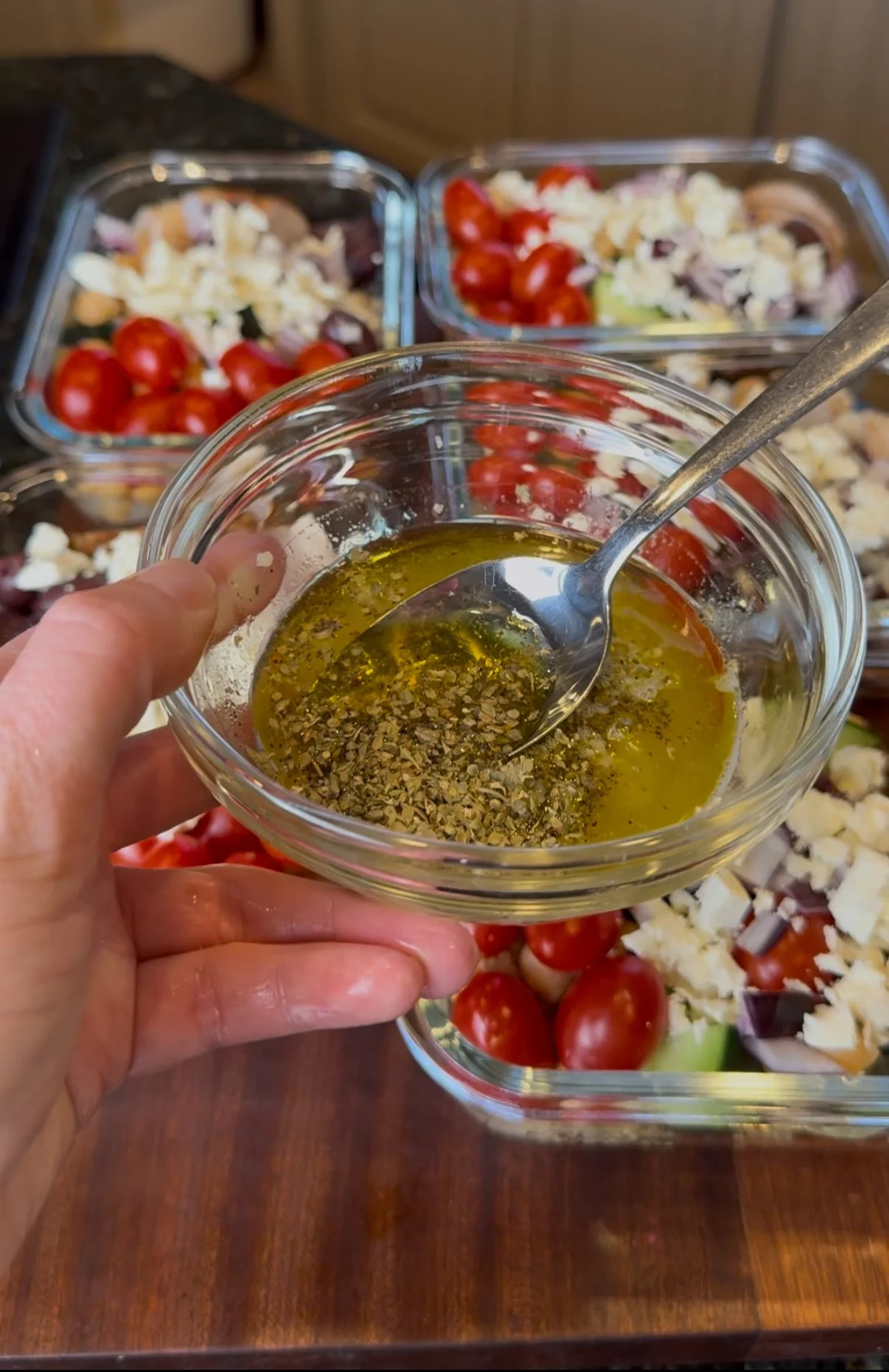 - Prepare the dressing: In a small bowl, whisk together olive oil, lemon juice, garlic, oregano, salt, and pepper.