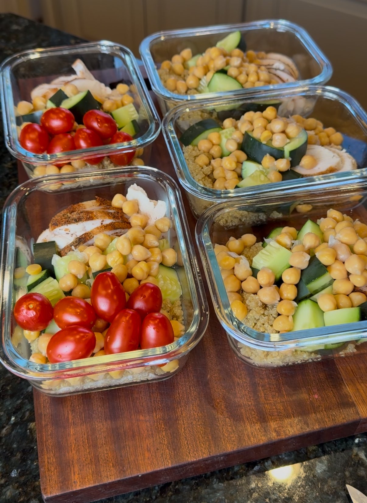 - Assemble the bowls: Divide the cooked quinoa and chicken among 5 meal prep containers. Top each with chickpeas, cucumber, cherry tomatoes, red onion, olives, and feta cheese.