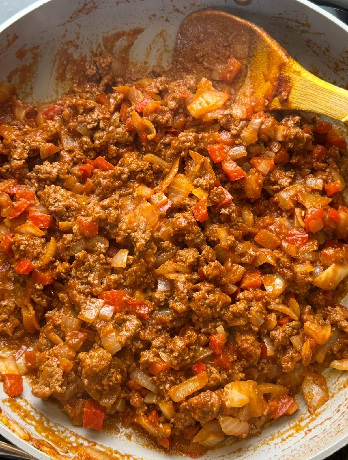 - Add ground beef, breaking it up as it cooks. Once browned, stir in tomato sauce, tomato paste, liquid/coconut aminos, apple cider vinegar, Dijon mustard, smoked paprika, salt, pepper, and cayenne (if using). Let simmer for 5 minutes until thickened.