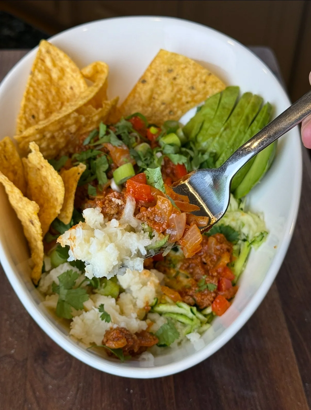 - Garnish with green onions, avocado, cilantro, and chips for crunch.