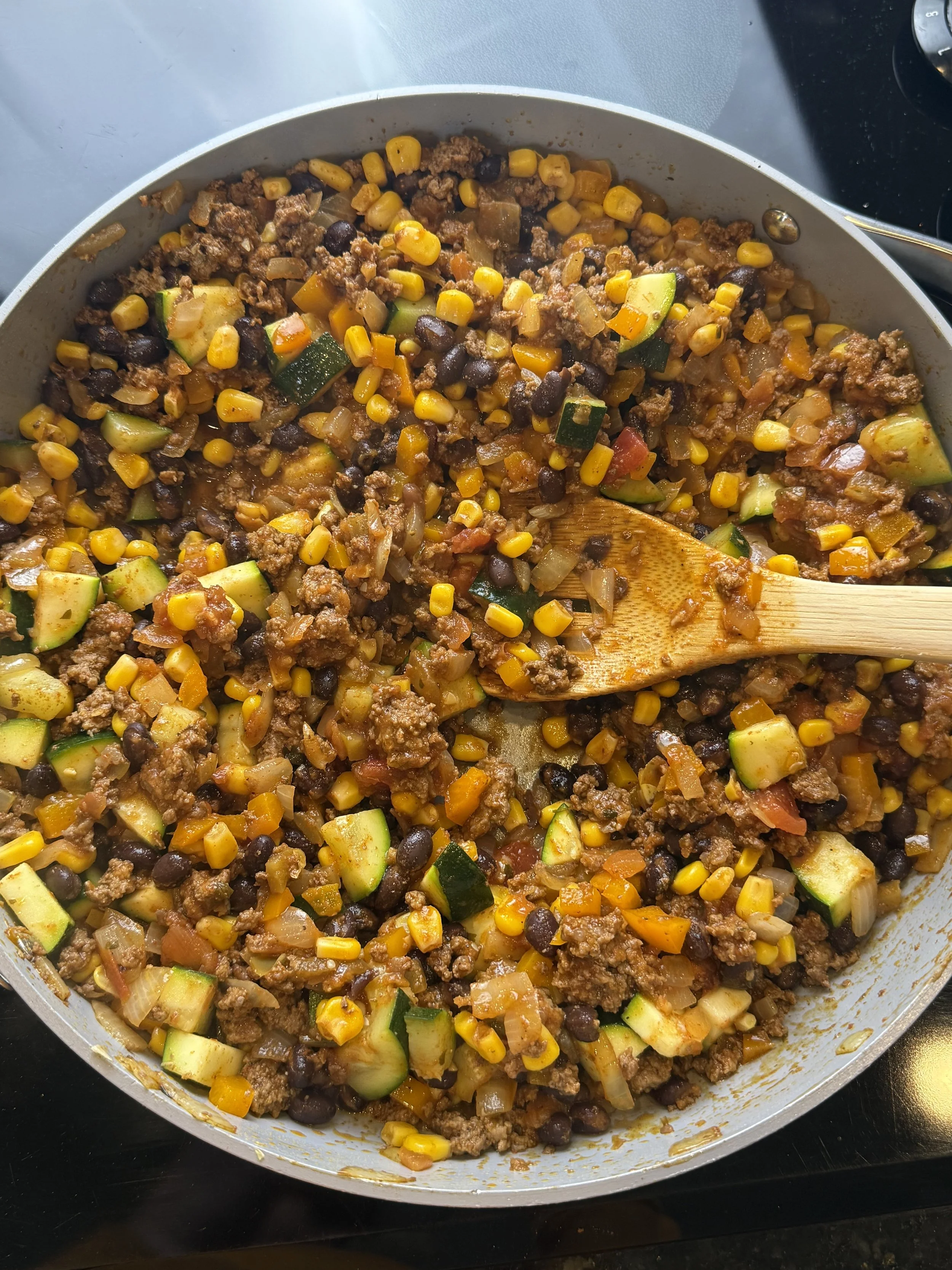 - Stir in bell pepper, zucchini, beans, and corn. Cook for 5–7 minutes, until veggies are tender.