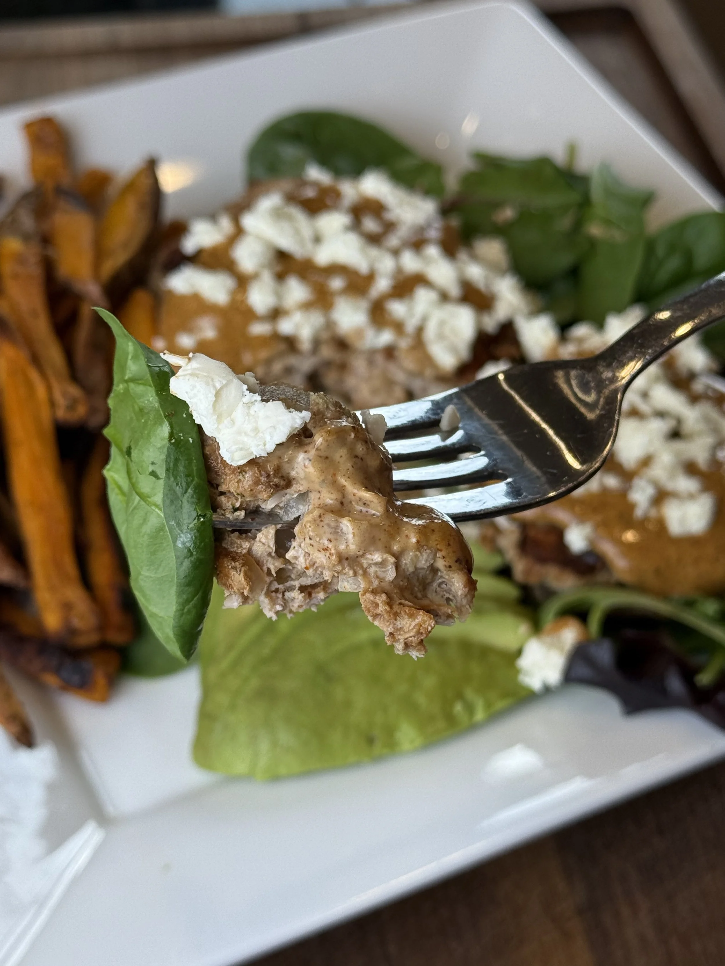 - In each bowl, layer spring greens, a burger patty, sliced avocado, sweet potato fries, a drizzle of chipotle mayo, and crumbled feta on top if desired.