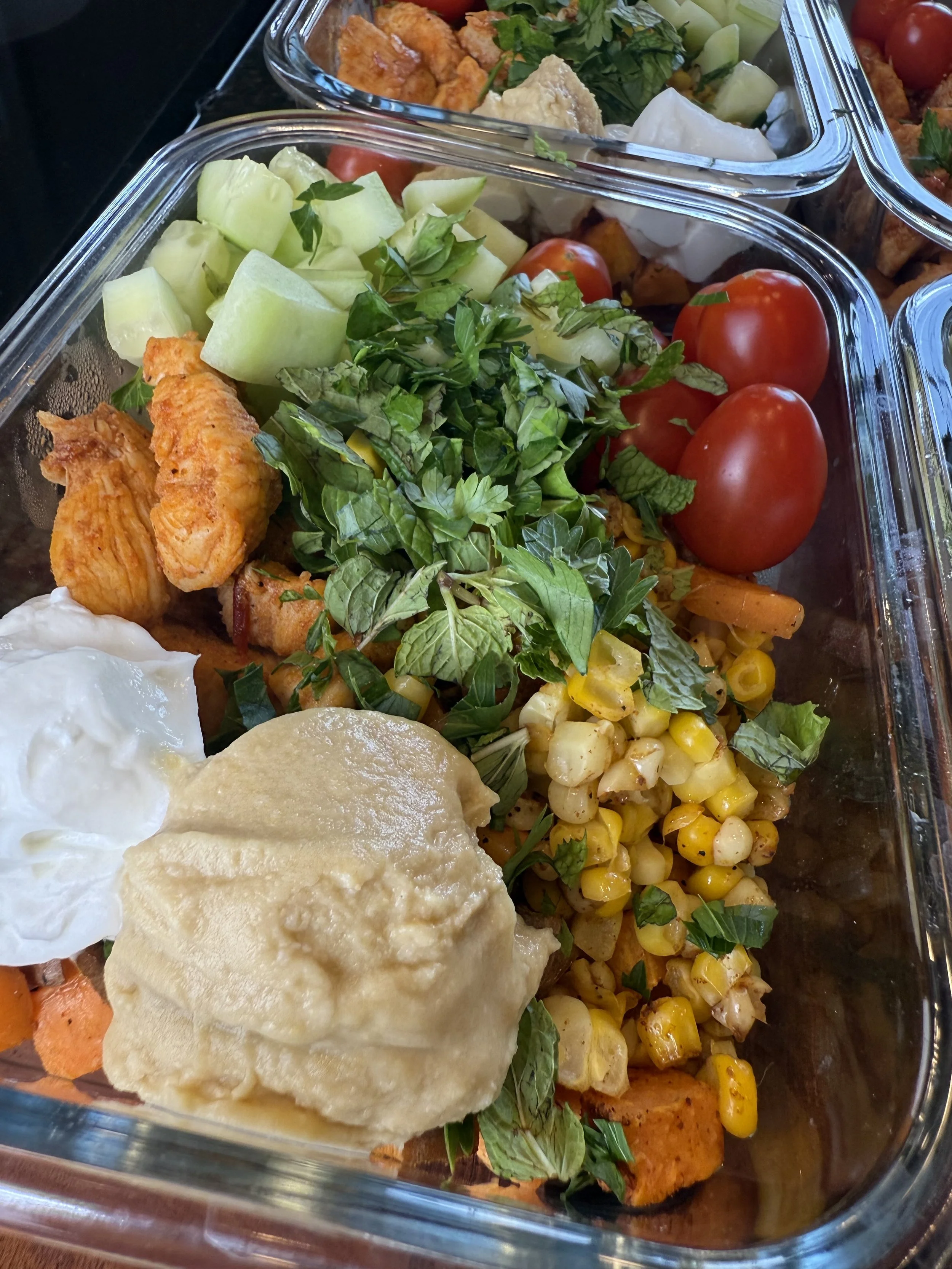 - In each meal prep container, layer: ½ cup turmeric quinoa, ¼ of the harissa honey chicken, roasted corn and sweet potato, fresh cucumber and tomatoes, and optional herbs + sauce