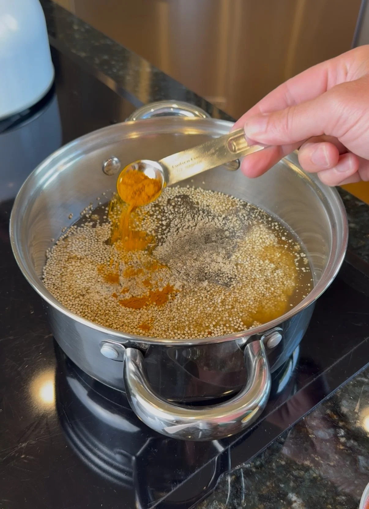 - Add quinoa, turmeric, garlic powder, and broth/water to a pot.