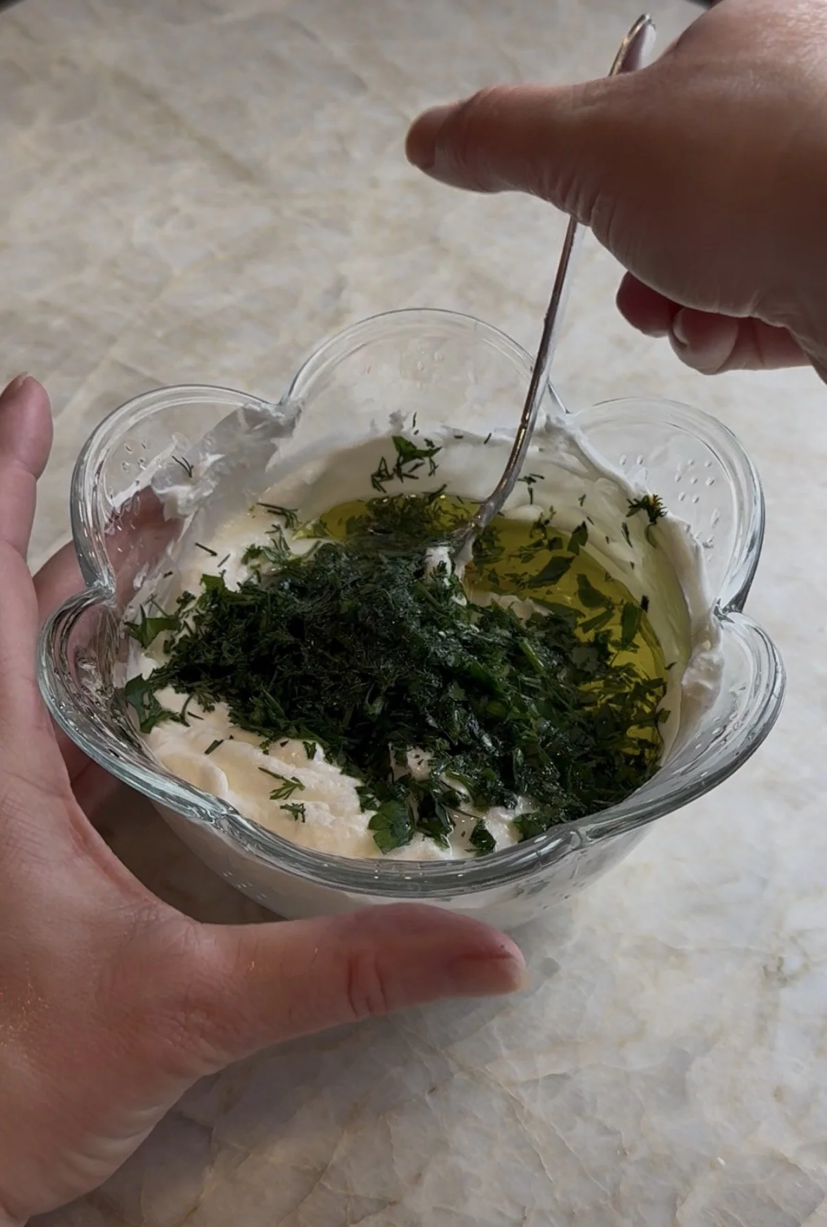 - Stir yogurt, lemon juice, olive oil, herbs, and salt until smooth.