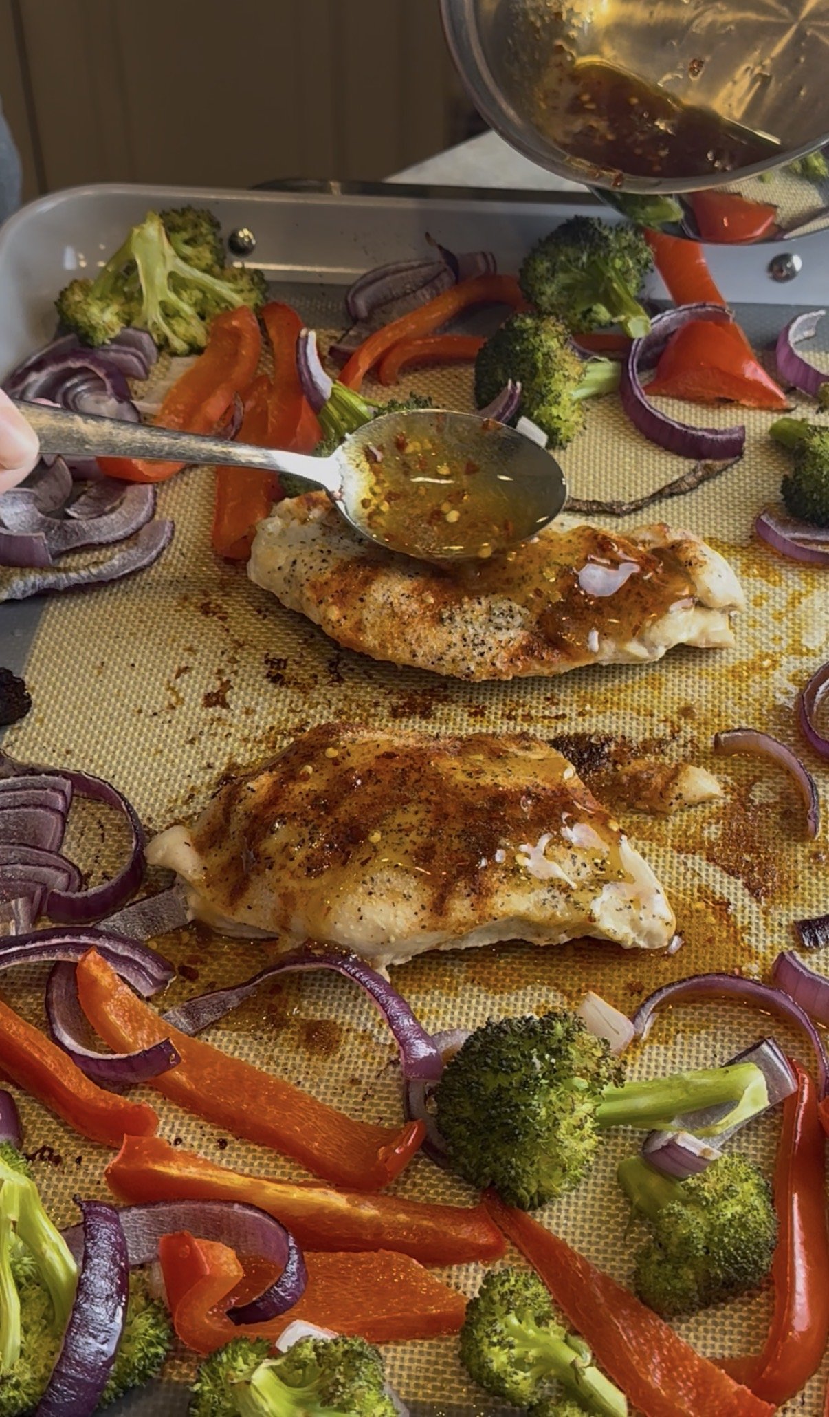 - Remove pan from oven, drizzle hot honey generously over chicken, return to oven for 5 more minutes.