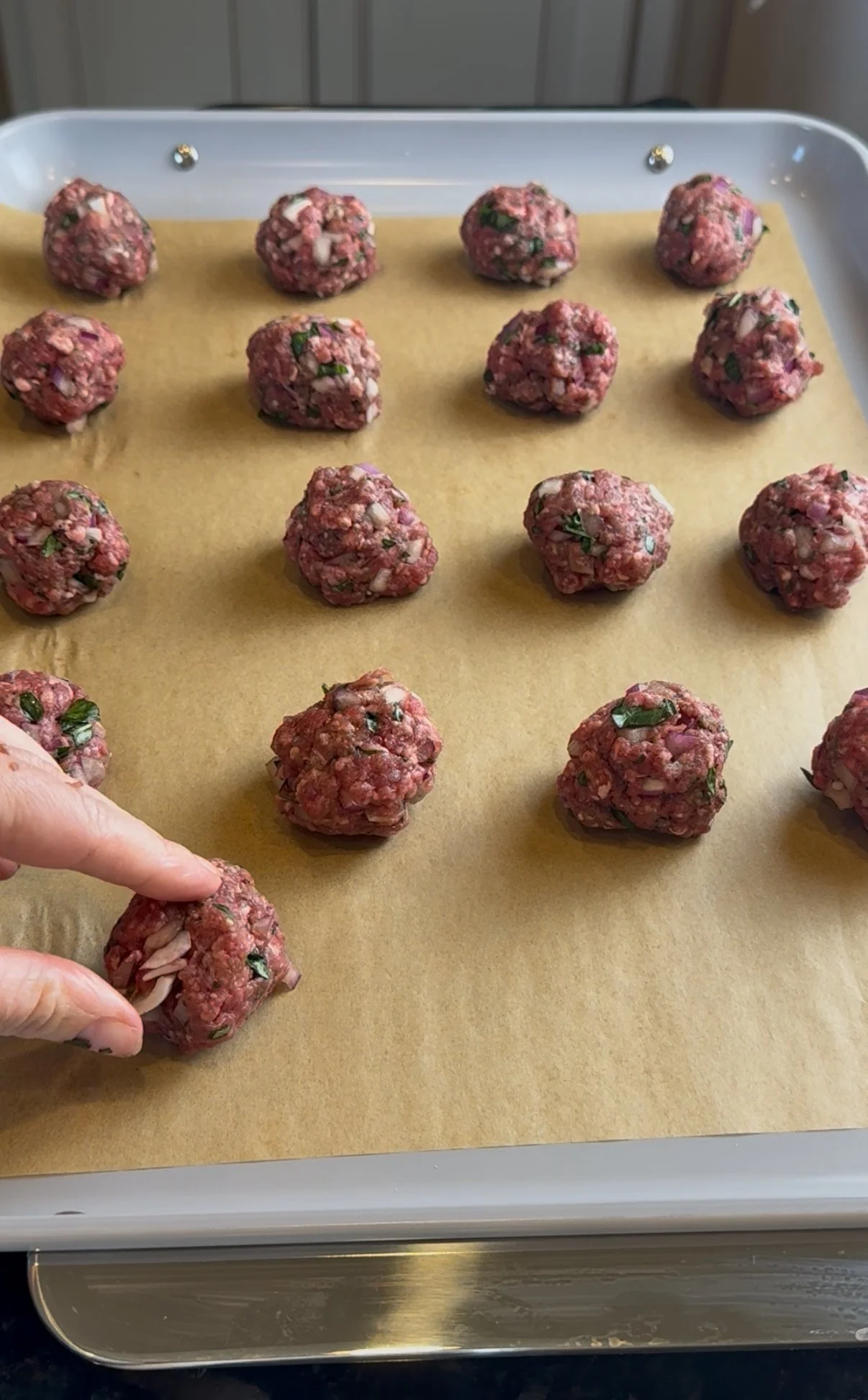 - add all ingredients to a large bowl and mix well with your hands. Then roll into 2 inch meatballs and place on a baking sheet.