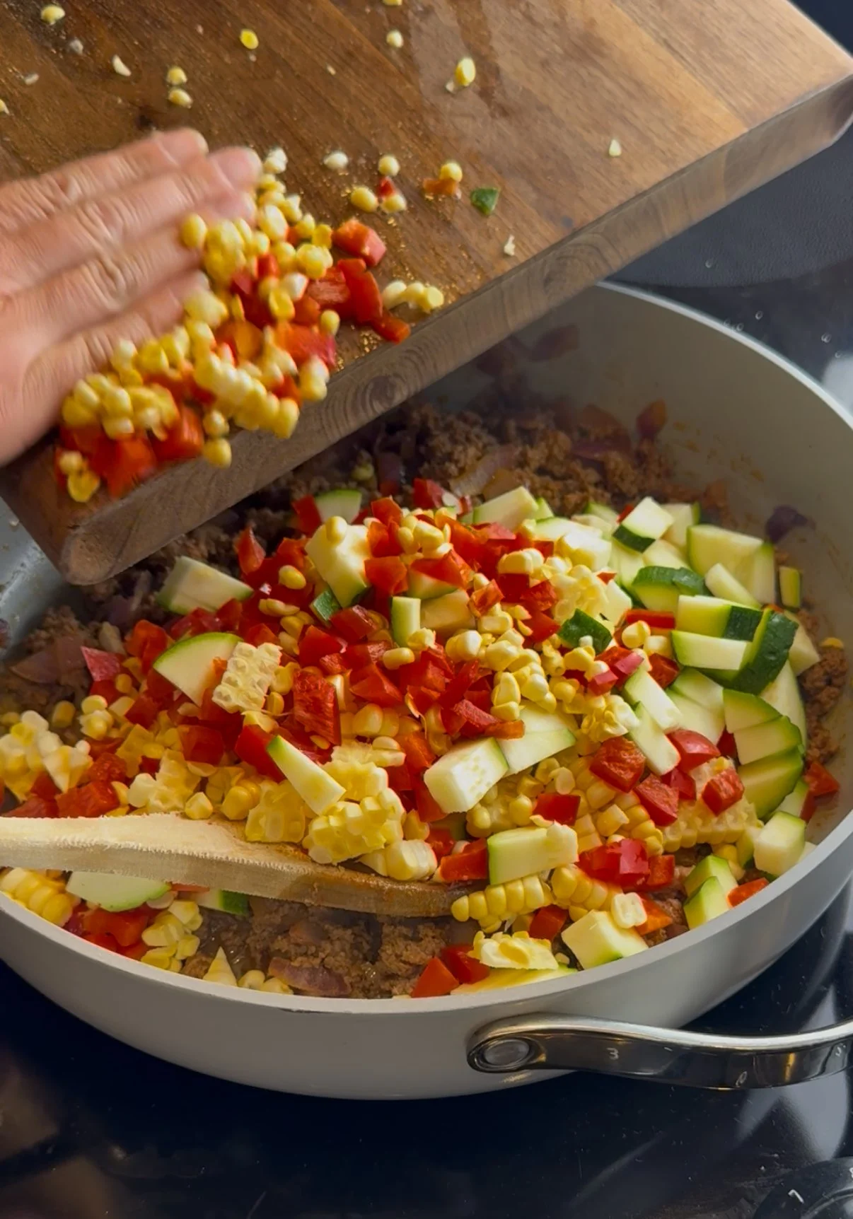- Stir in zucchini, bell pepper, and corn. Cook 5 minutes, stirring occasionally, until veggies are tender but still crisp.