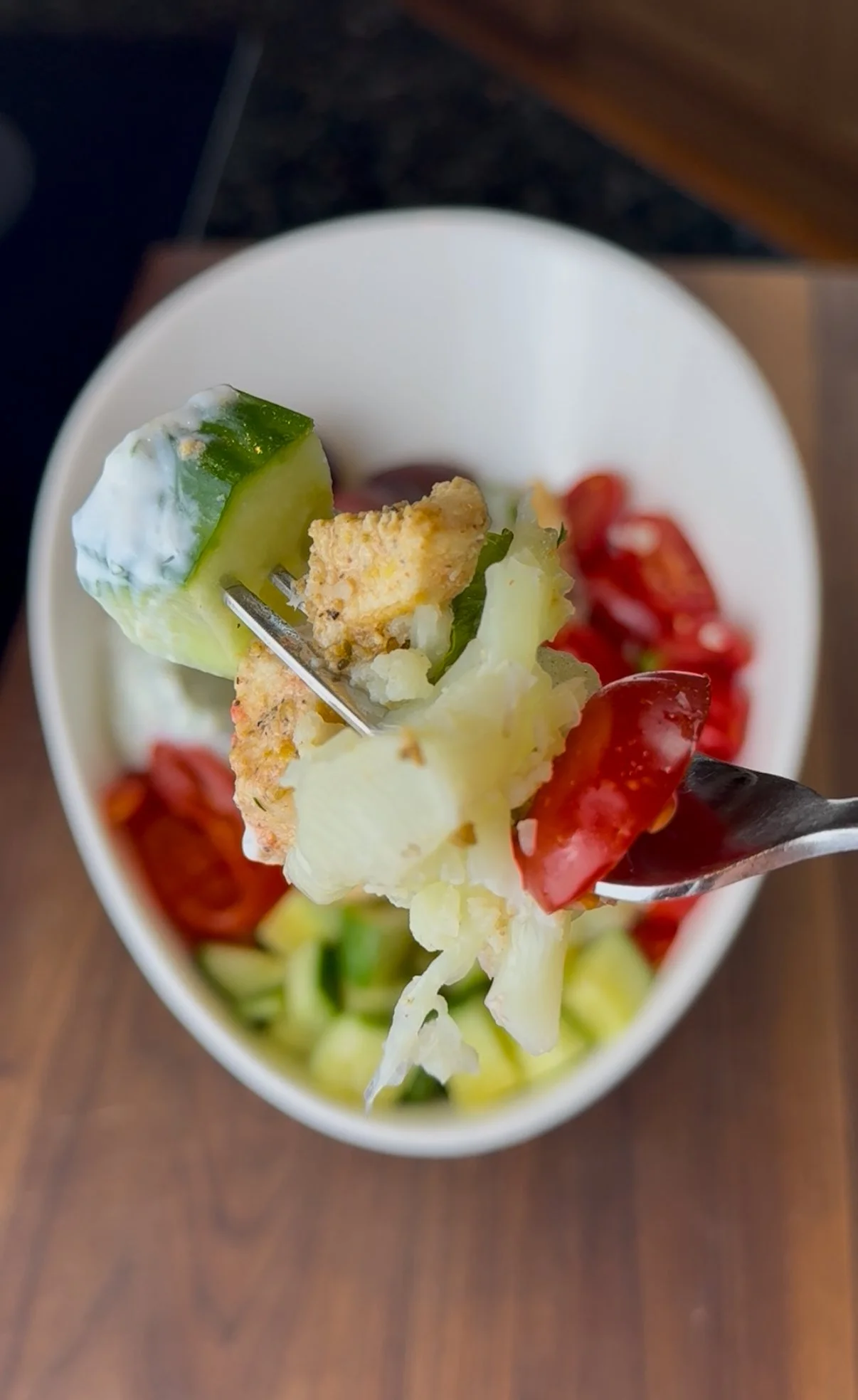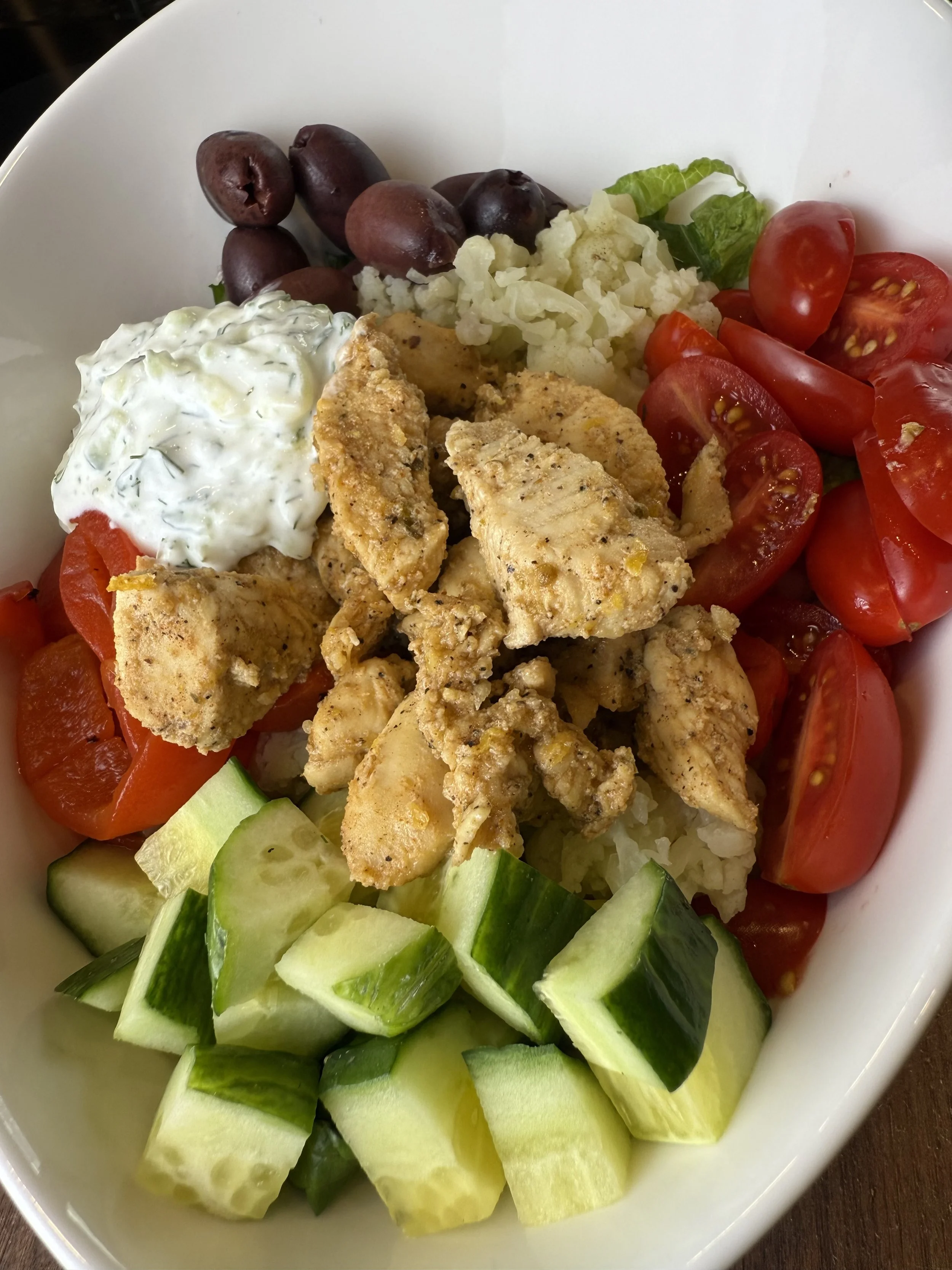 - Assemble bowls: add your base, top with chicken, fresh cucumber, veggies, olives, and romaine. Finish with tzatziki or hummus.