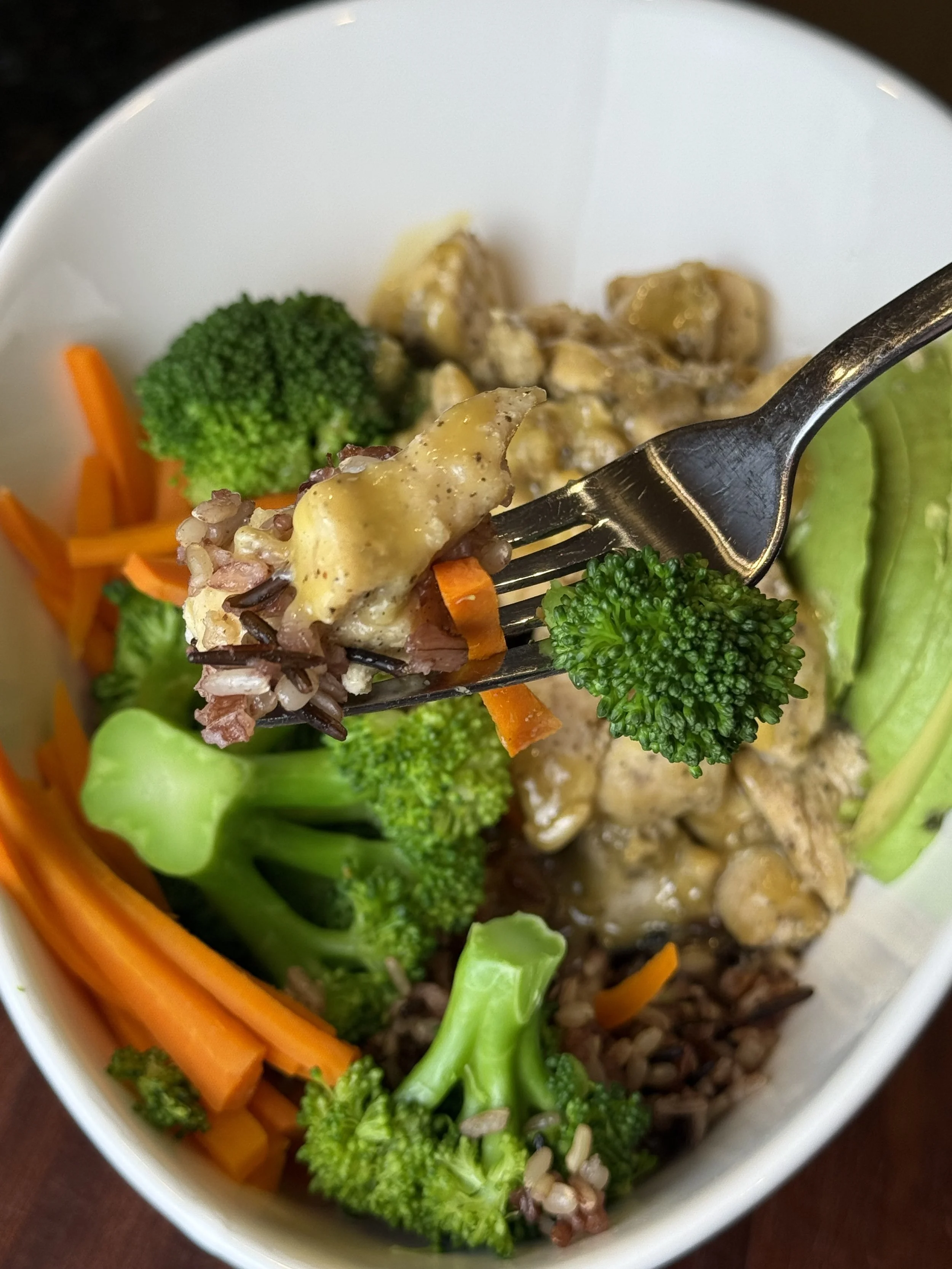 - Assemble bowls → Divide rice among bowls. Top with honey mustard chicken, broccoli, carrots, avocado slices, and drizzle extra sauce over the top.