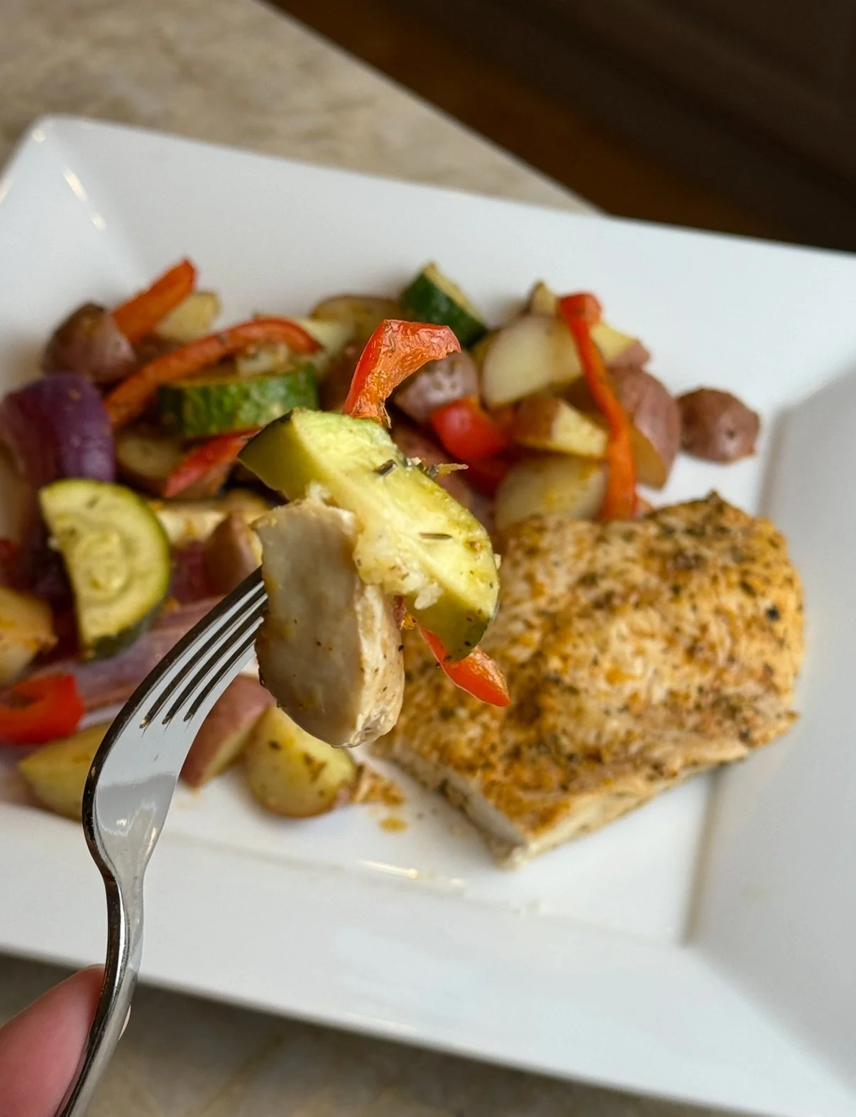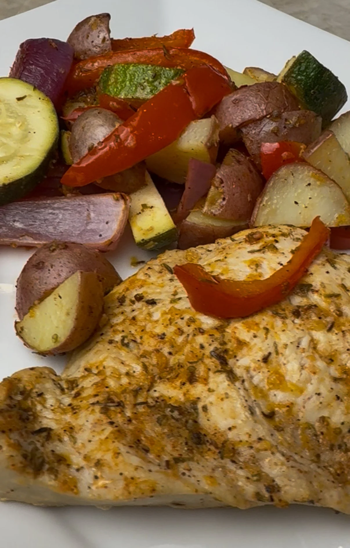 This is an easy, one-pan dinner made with whole food ingredients. Juicy chicken, crispy baby potatoes, roasted zucchini, bell pepper, and red onion are tossed in a bright lemon herb marinade for a healthy, gluten-free meal packed with protein and fiber. Perfect for busy weeknights and minimal cleanup.