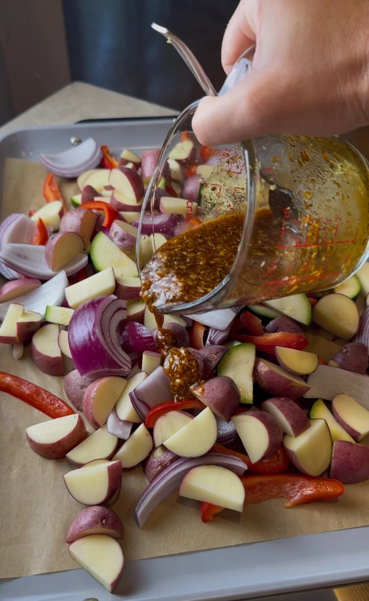 - Drizzle the marinade over both chicken and veggies, tossing veggies to coat evenly.