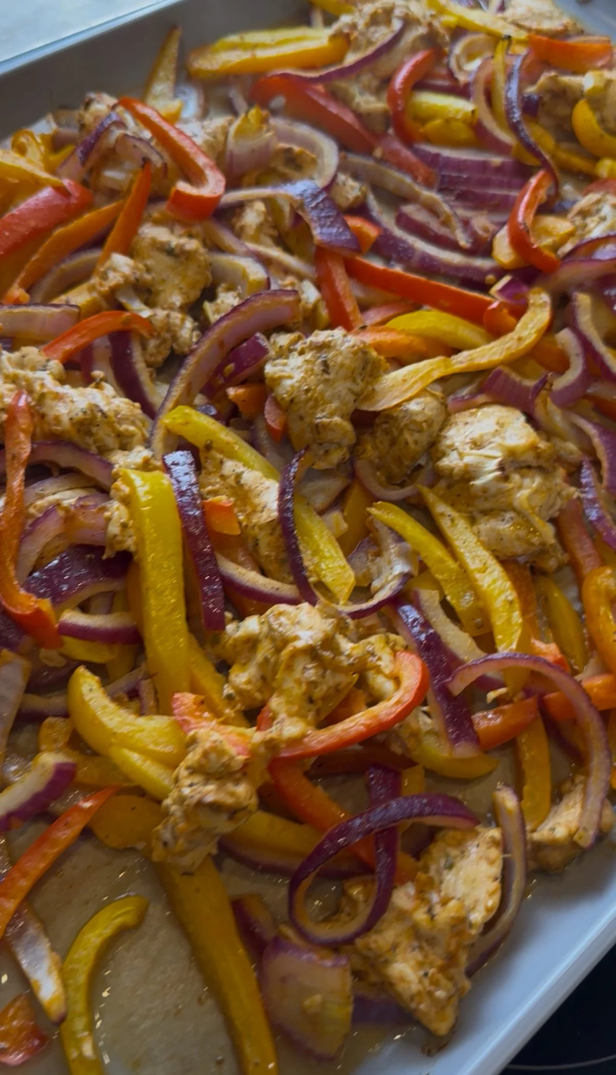 - Toss chicken, peppers, and onion in the marinade until coated. Spread evenly on the sheet pan.