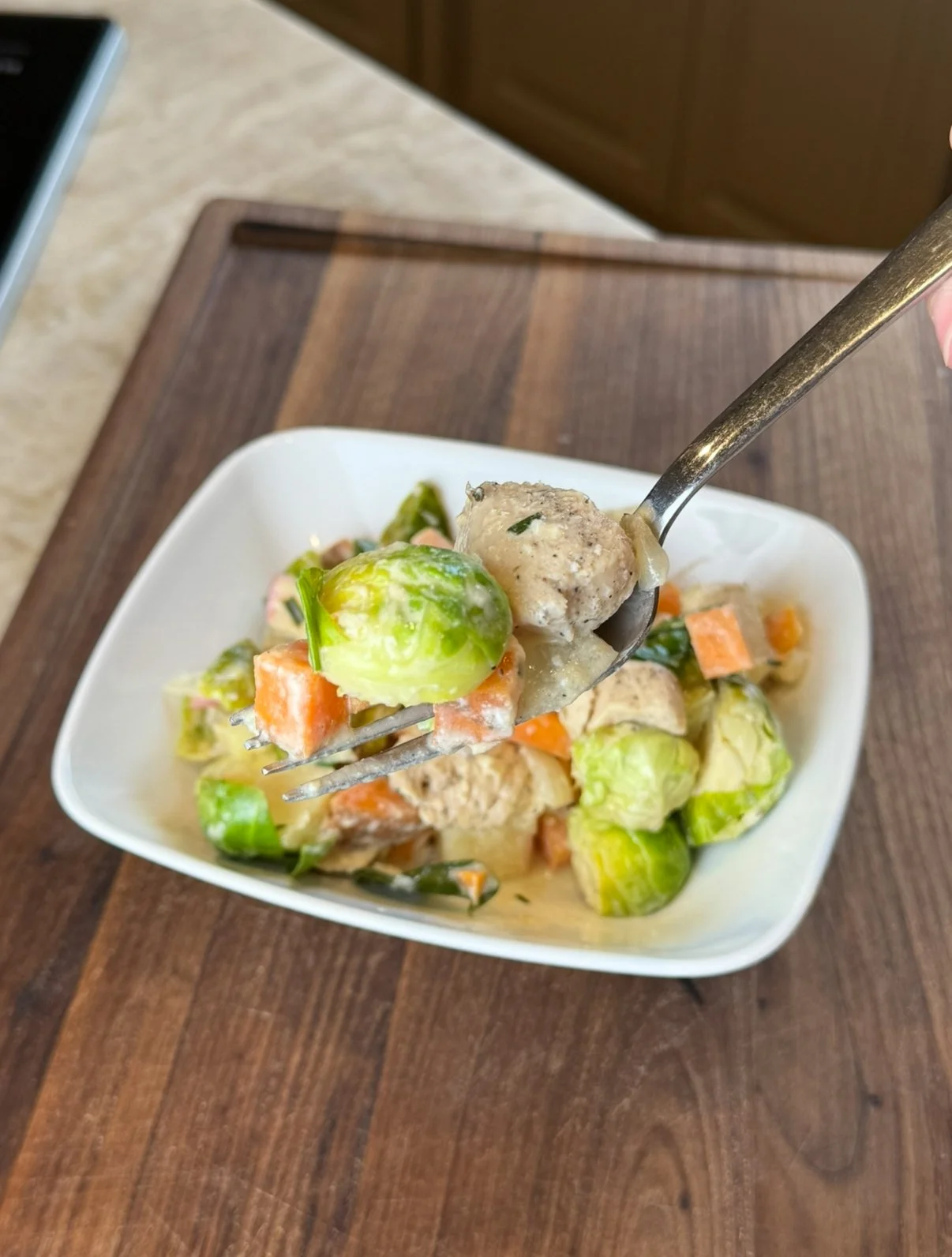 - In the same pan, sauté onion and sweet potato’s. Sometimes I’ll add a little water to the pan to get the sweet potatoes to soften quicker. Add garlic, cook for one minute and then add Brussels sprouts; cook for 8–10 minutes, until just tender.