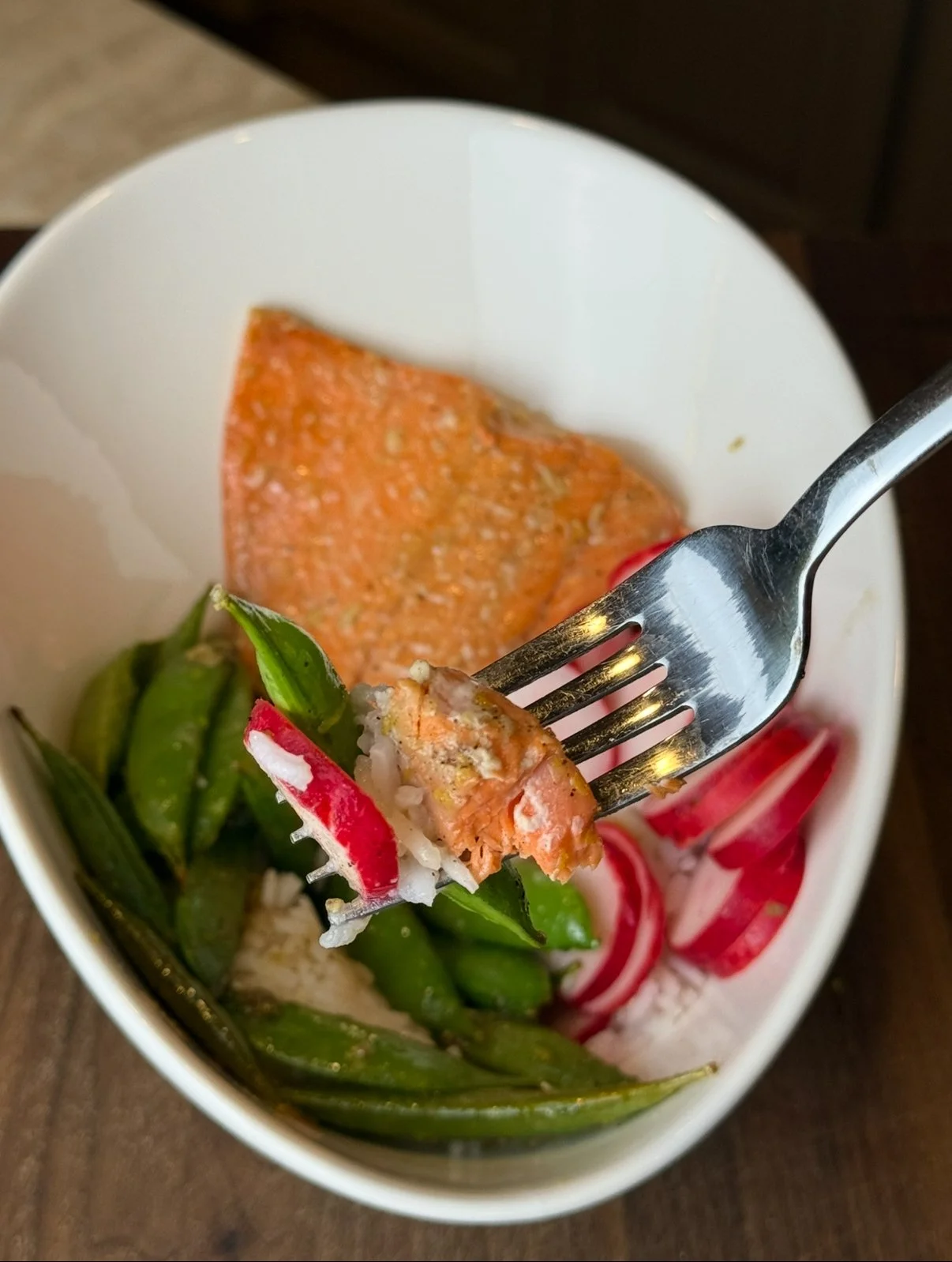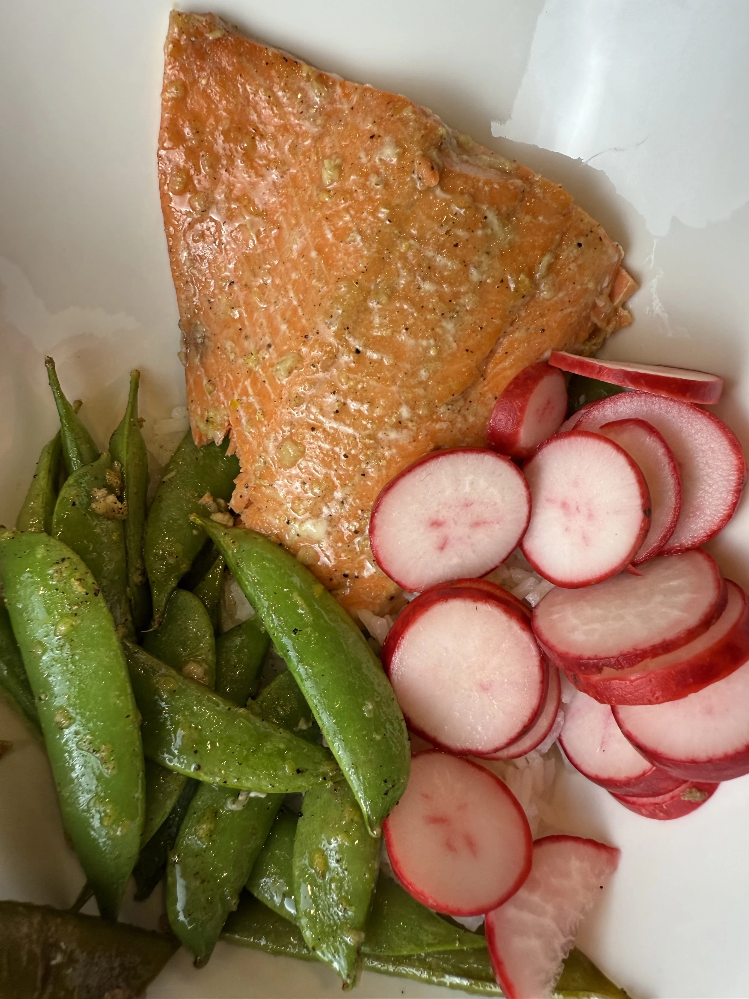 A bright, gut-healthy dinner that’s as nourishing as it is flavorful. Made on one pan with real, whole-food ingredients, this gluten-free salmon recipe features tender, oven-baked salmon topped with a light glaze and served with crisp peas and tangy pickled radish for a fresh, balanced meal.