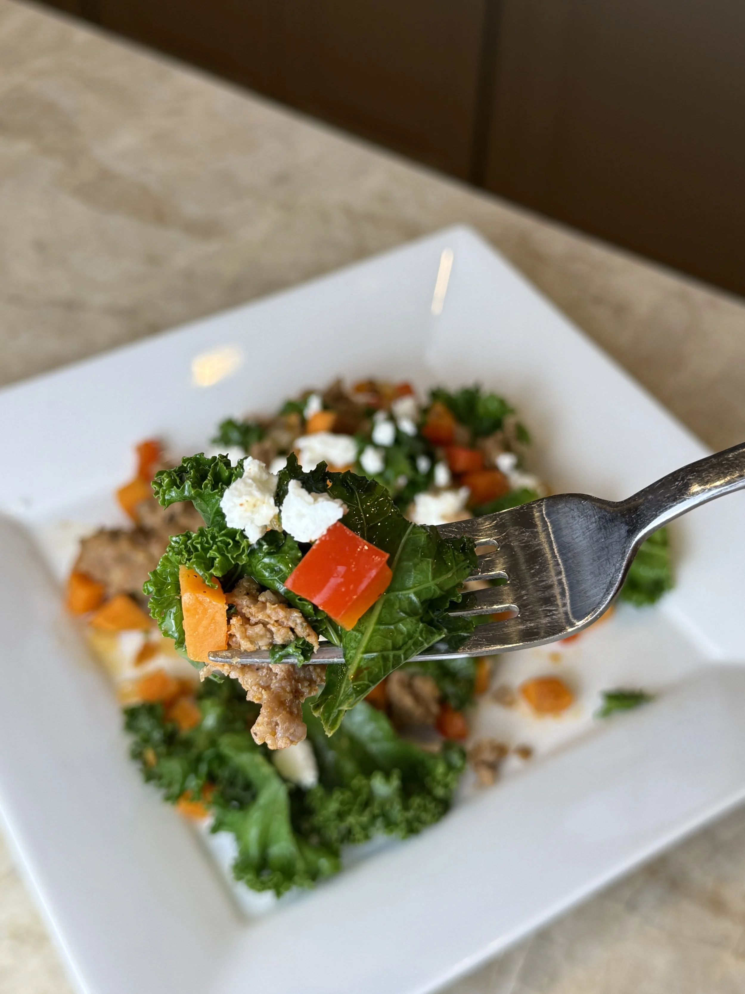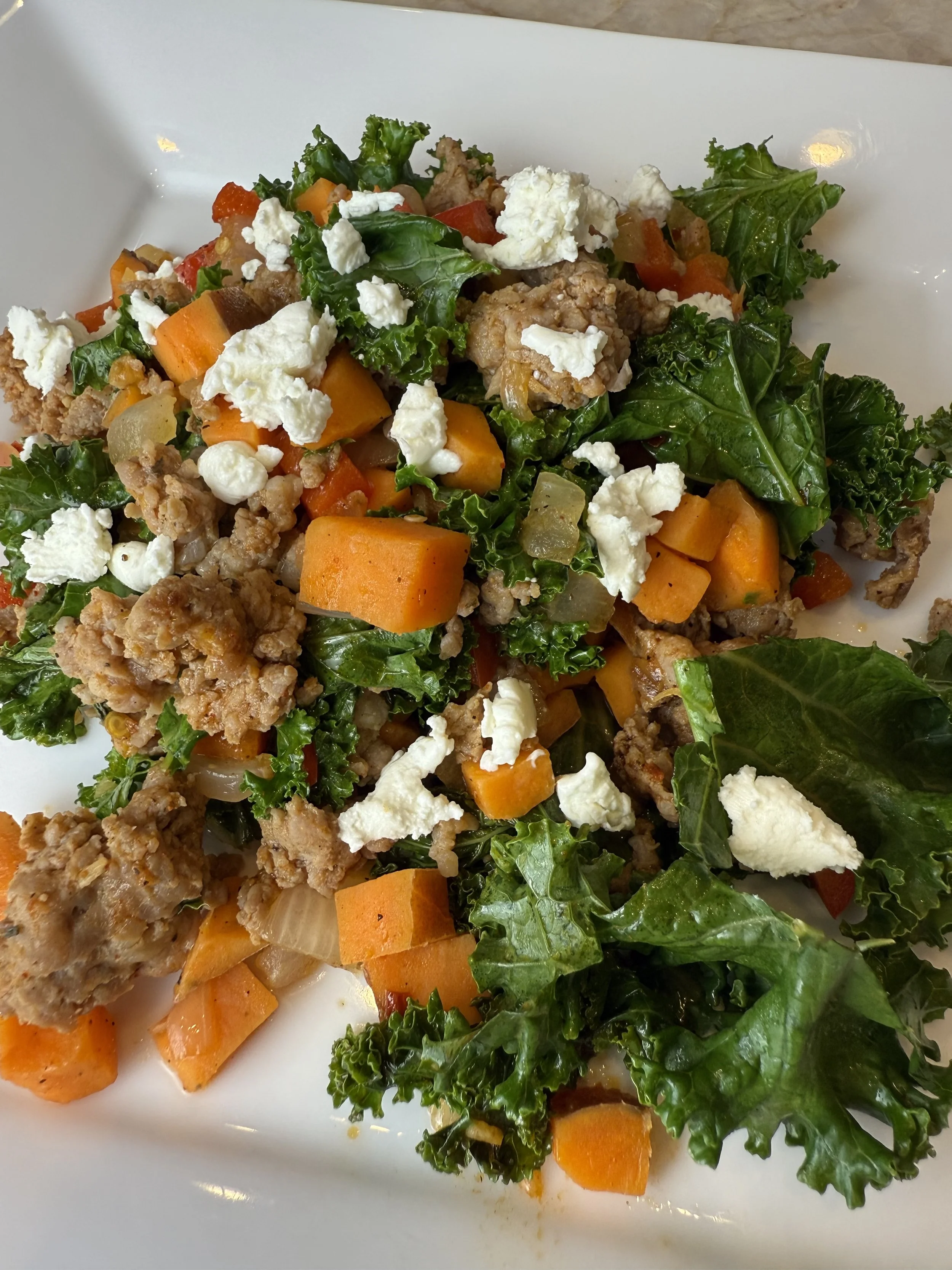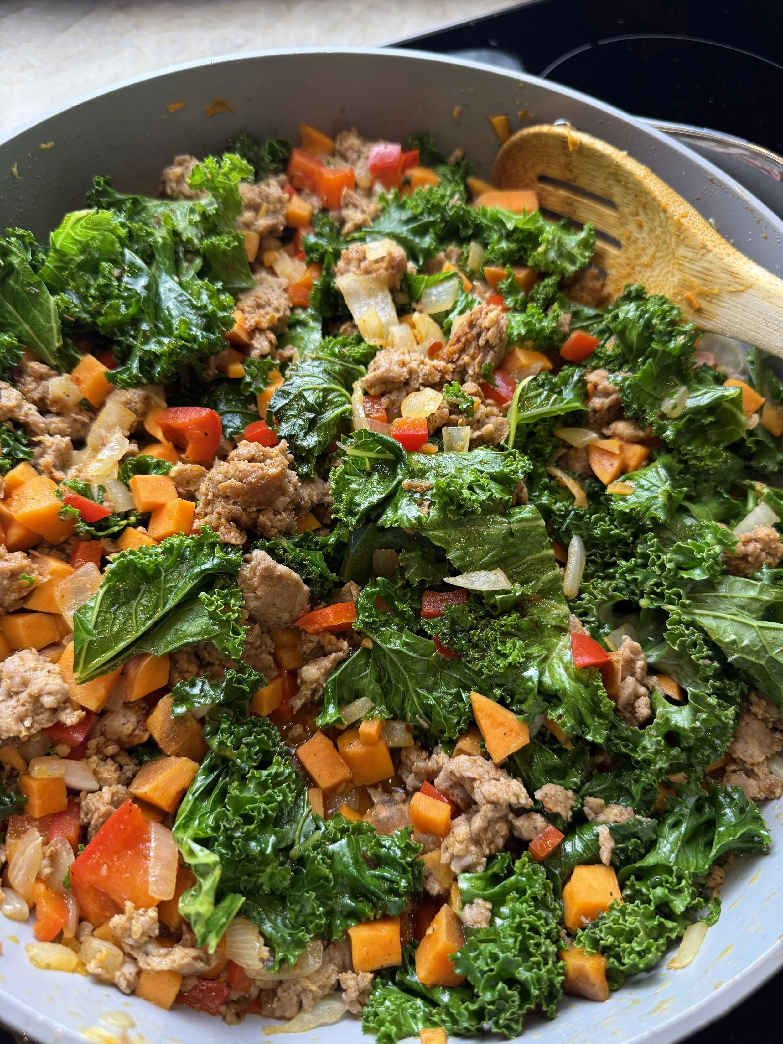 One Pan Turkey Sausage Kale and Sweet Potato Skillet