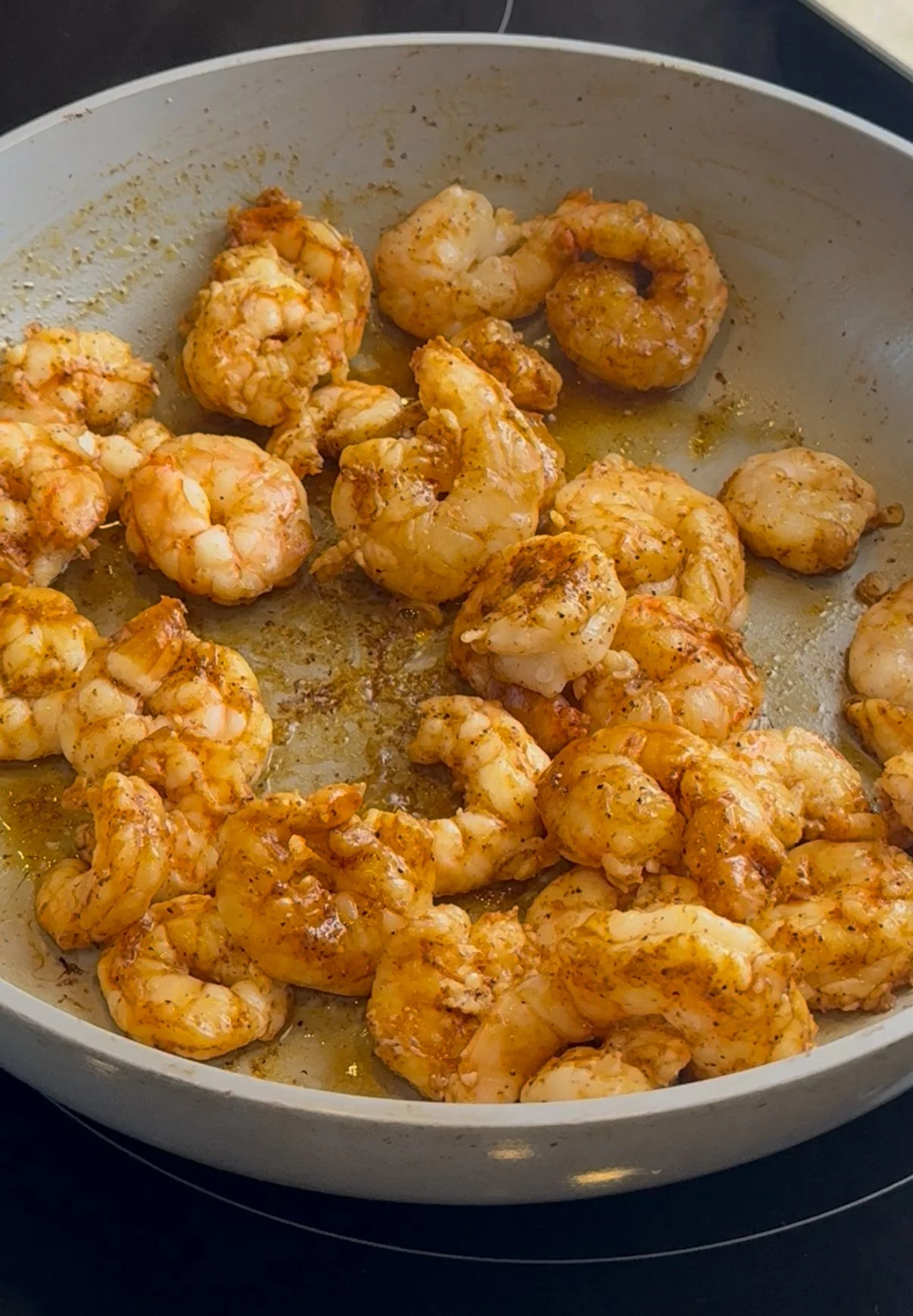- season shrimp with salt, pepper and chipotle powder. Drizzle a pan with oil and cook until shrimp is pink.