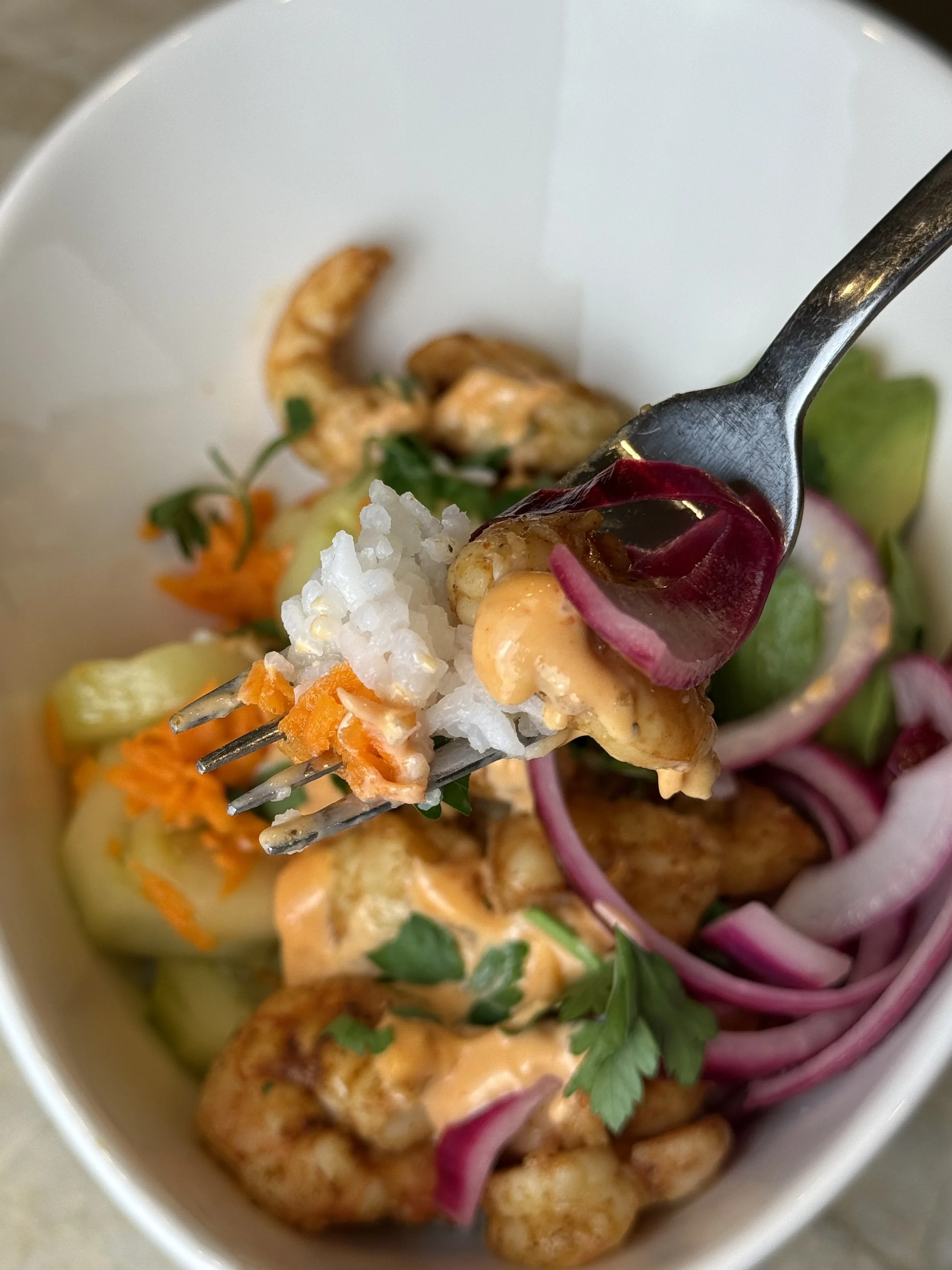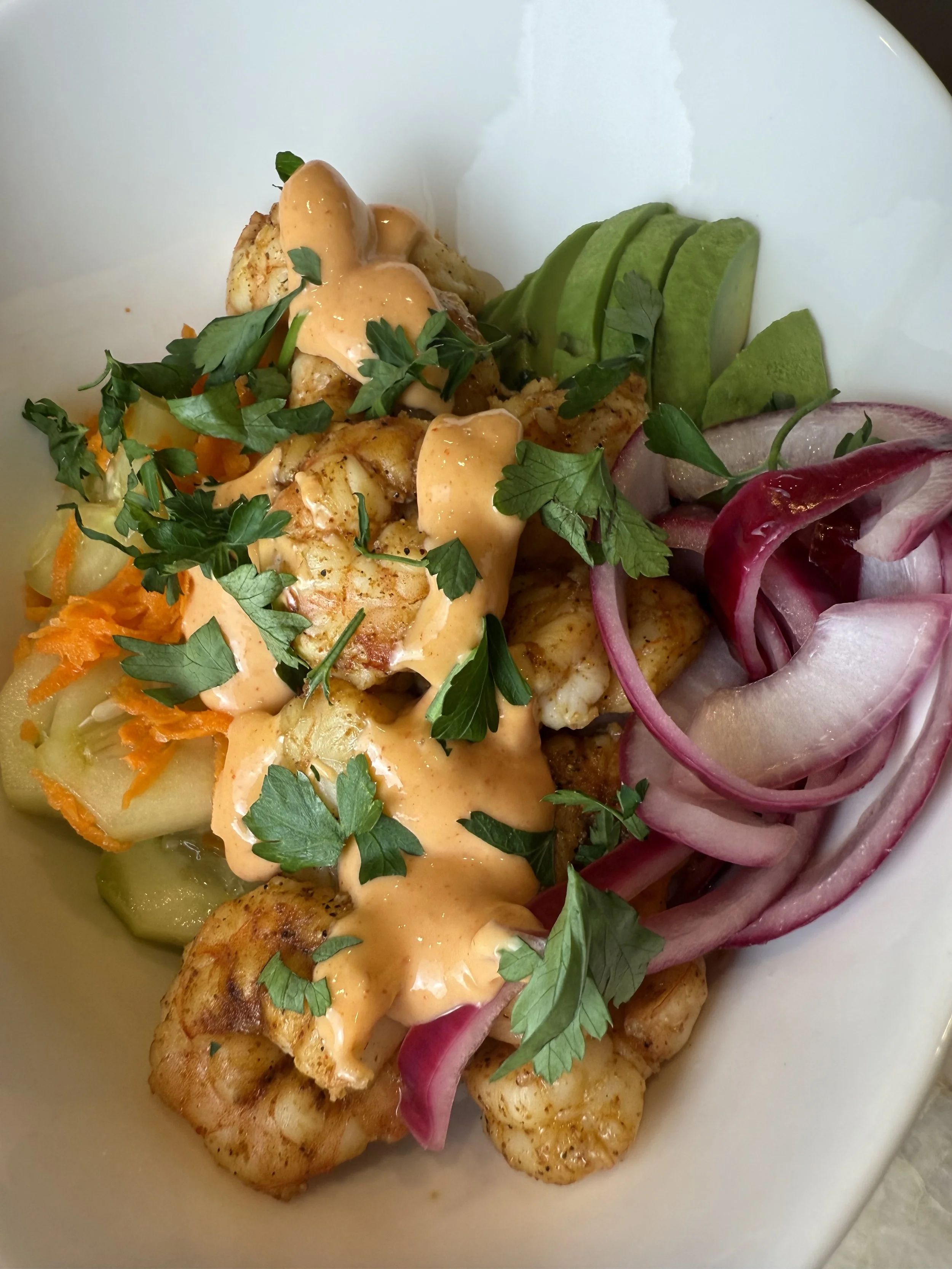 - layer bowls with rice, shrimp, pickled veggies, pickled red onions and cilantro/parsley. Drizzle with the sriracha mayo.