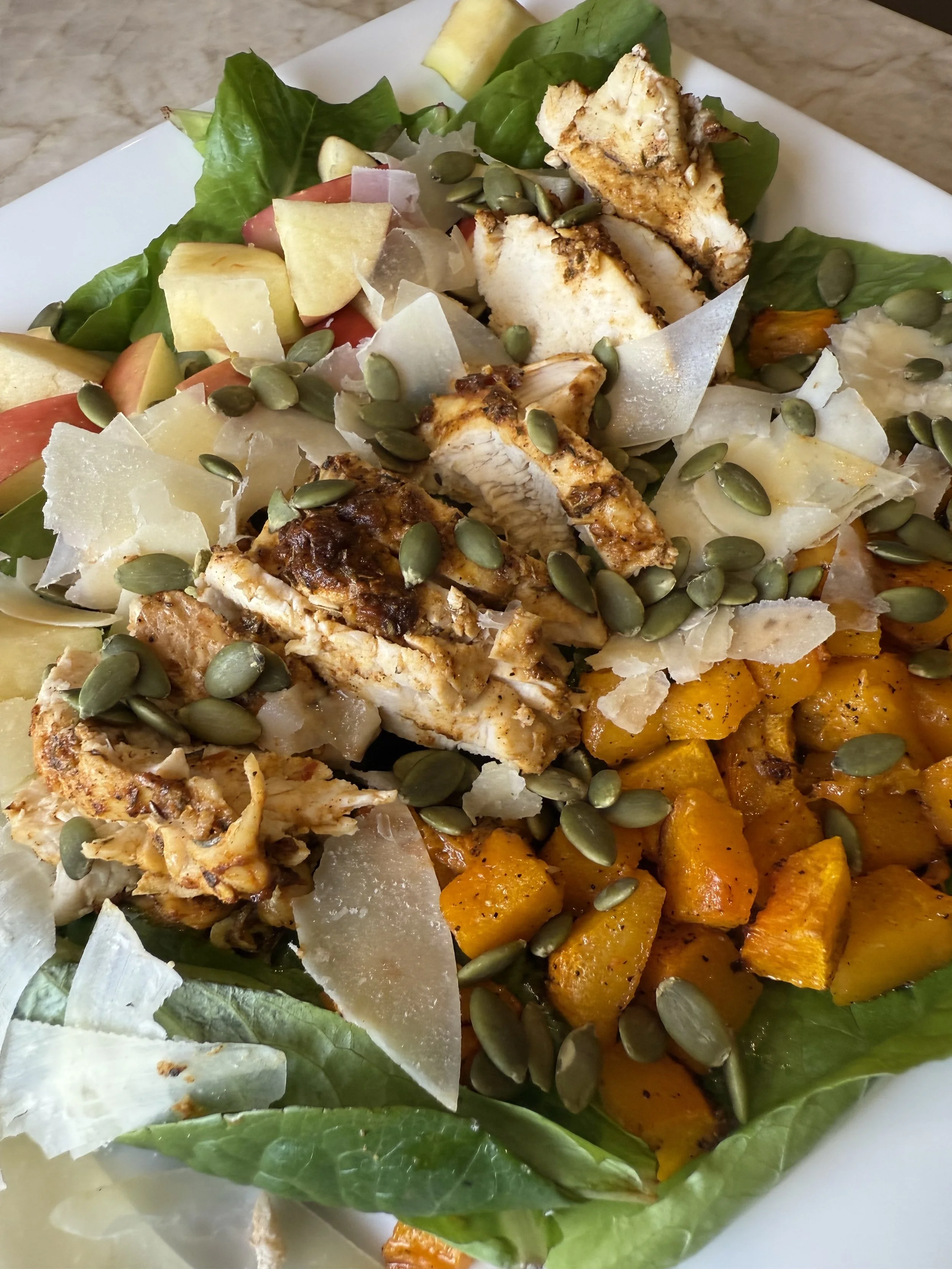 - Assemble the salad by layering greens, apple, squash, pumpkin seeds and Parmesan. Slice chicken and place on top of the salad. Finish by drizzling the Cesar dressing.
