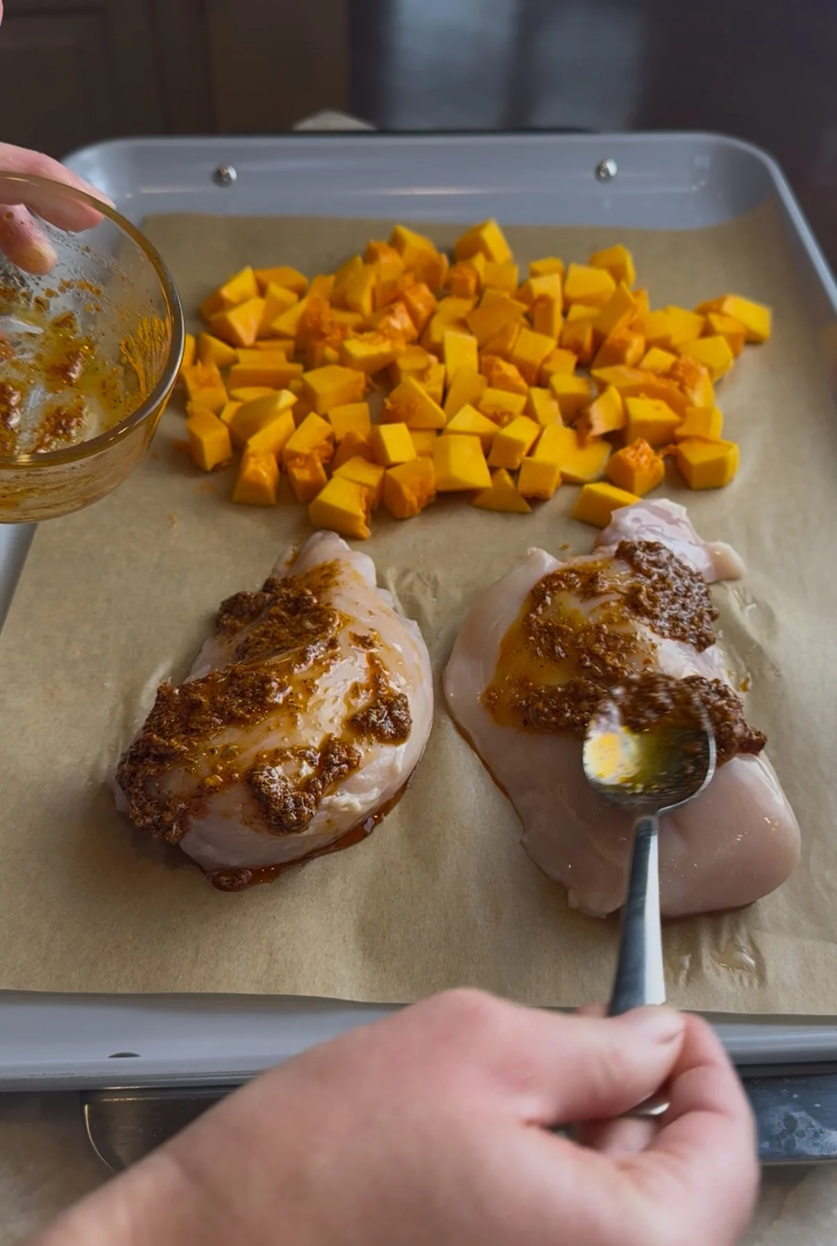 - In a small bowl, combine garlic, mustard, smoked paprika, thyme, chili flakes, salt, and pepper. Spread this mixture over your chicken breasts on a sheet pan.
