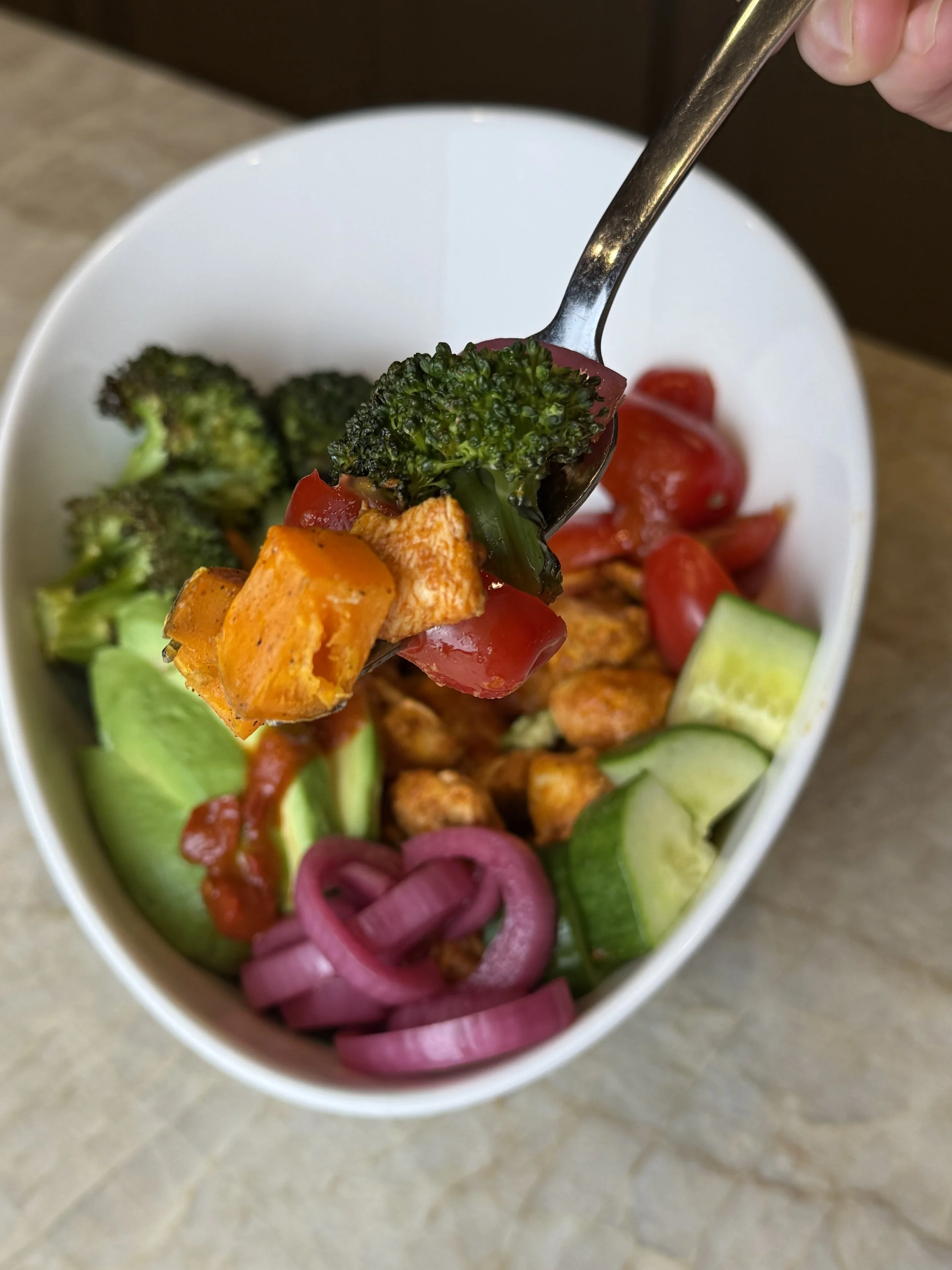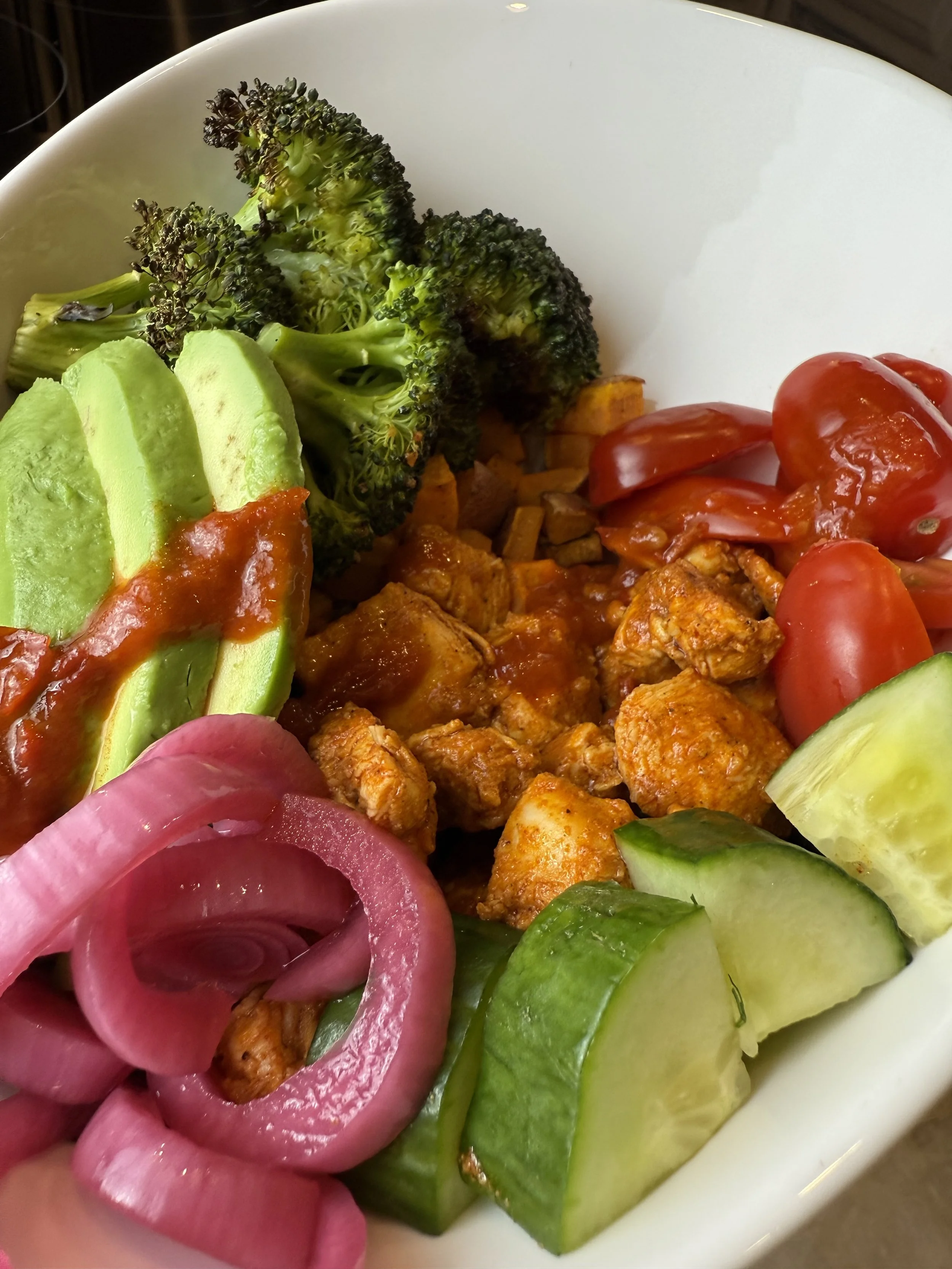 - Build your bowl! Layer greens, roasted veggies, chicken, fresh veggies, tzatziki and extra harissa!