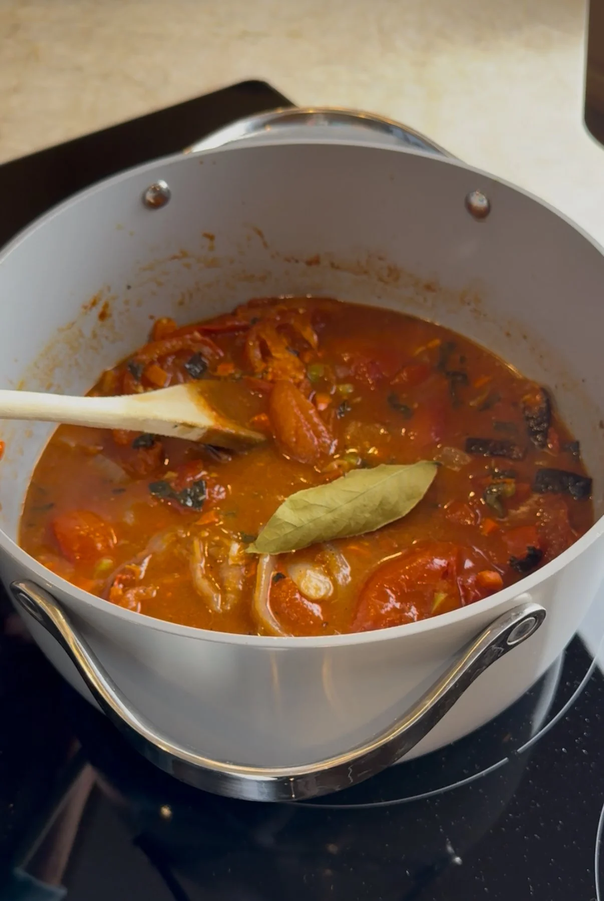 - Squeeze roasted garlic cloves into the pot. Add the roasted tomatoes and onions. Pour in broth, smoked paprika, bay leaf, salt, and pepper. Simmer 15–20 minutes to let everything meld.