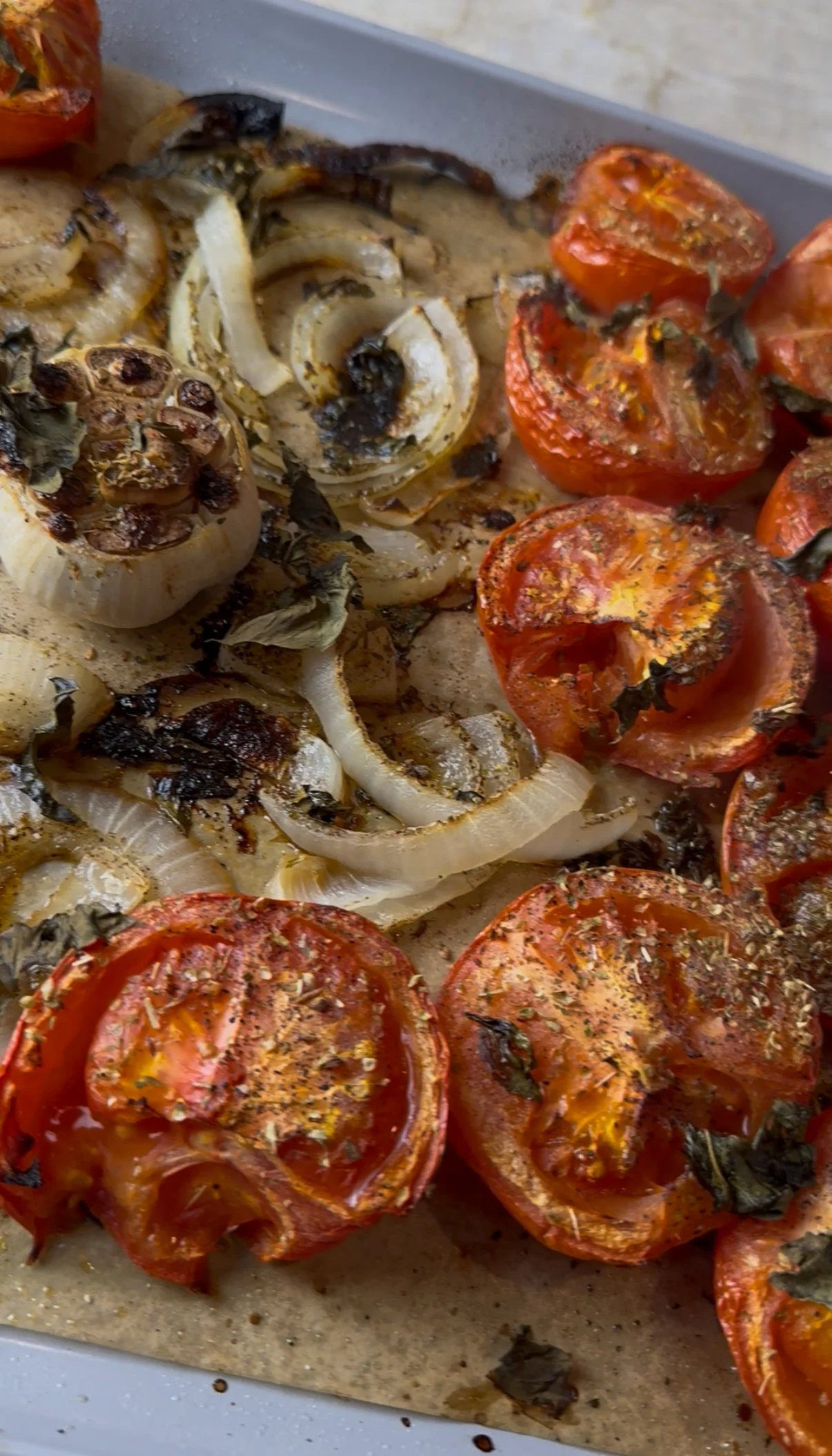 - Preheat the oven to 425°F. Add tomatoes (cut side up), sliced onion, and the whole head of garlic to a large baking sheet. Drizzle with oil, salt, pepper, and sprinkle the torn fresh basil over top. Roast 30–40 minutes, until tomatoes blister and the garlic is soft and caramelized.